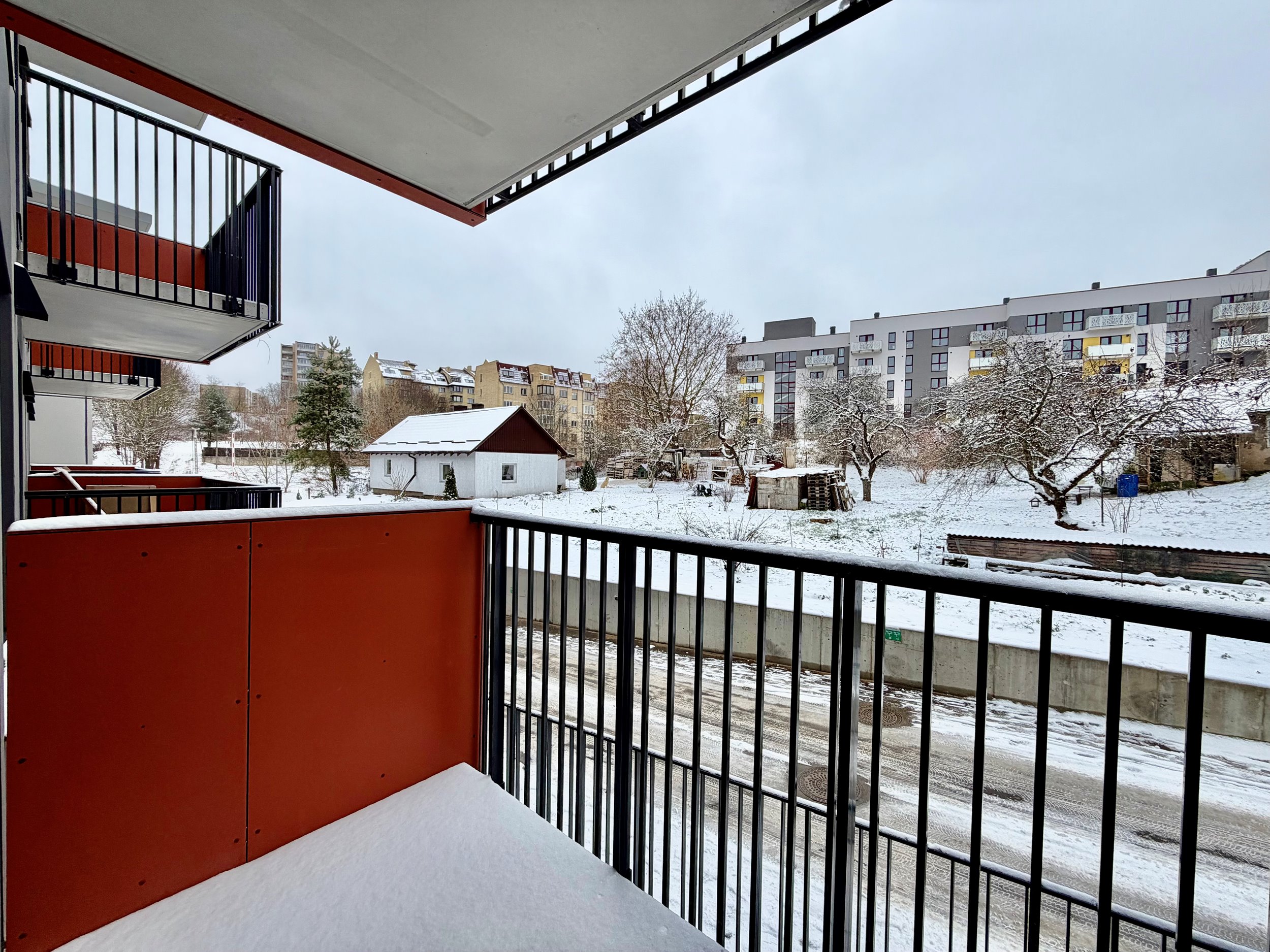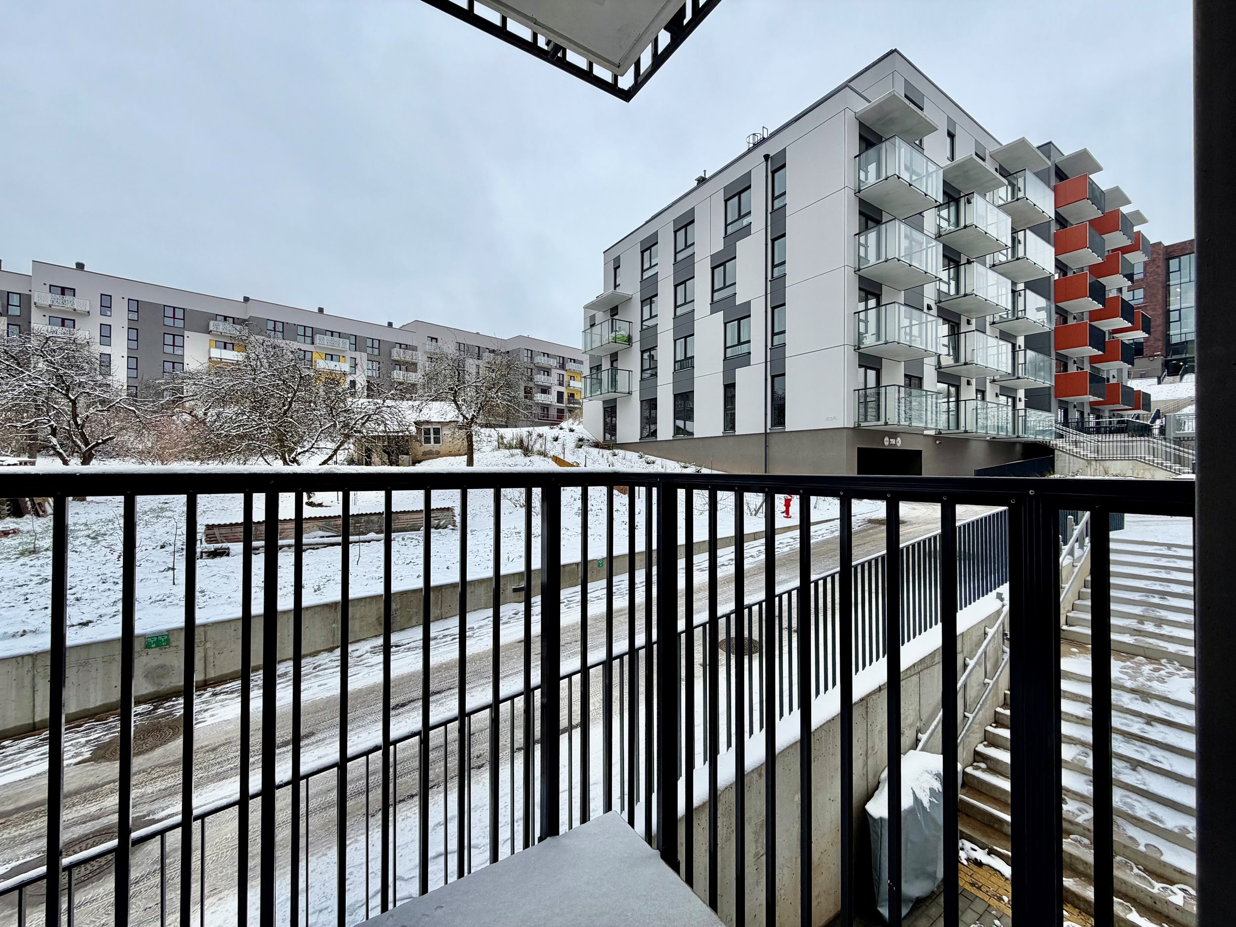 Išplanavimas: svetainė su virtuve ir valgomuoju, miegamasis, tualetas ir dušas, erdvus balkonas, rūbinė.