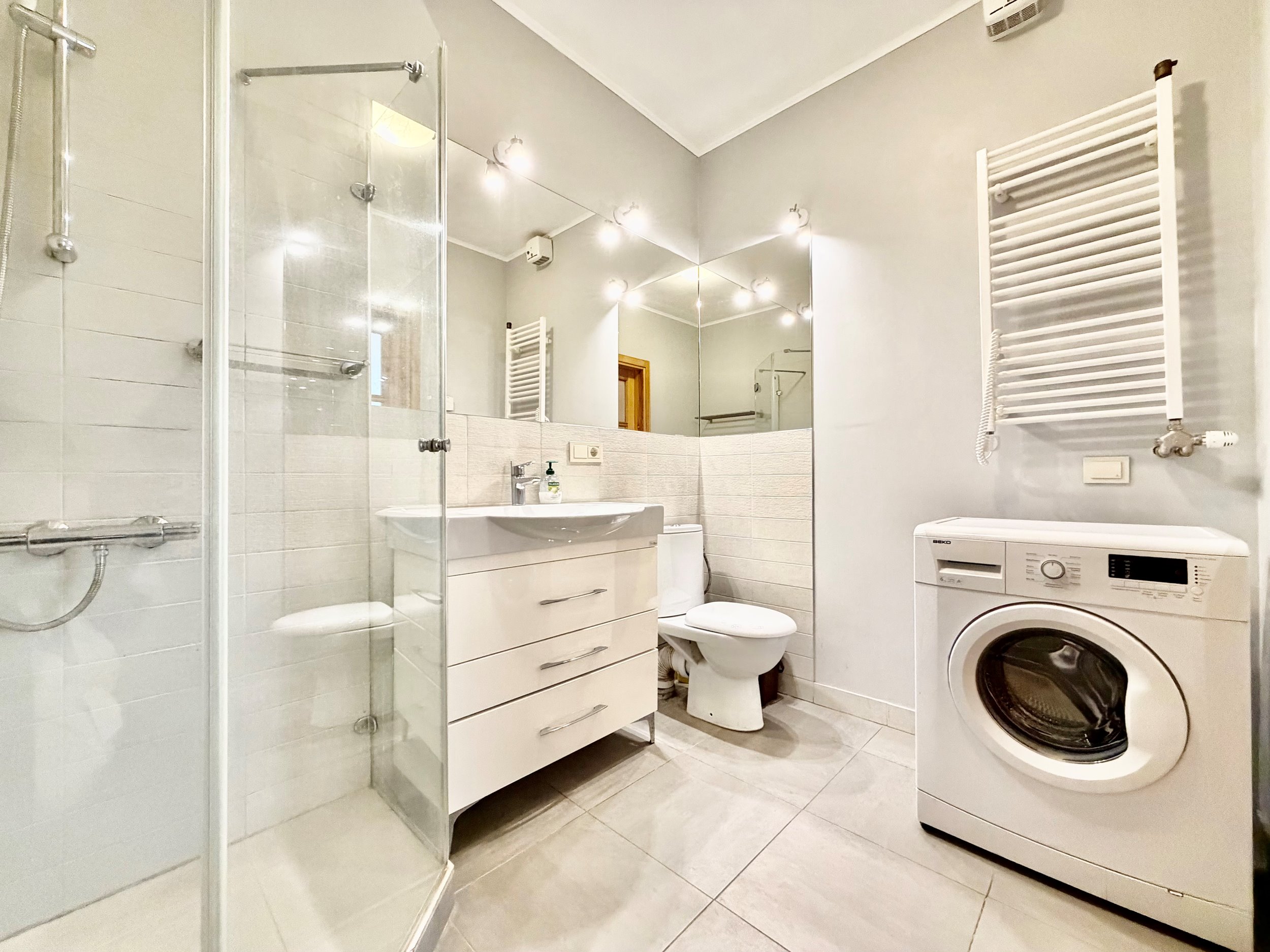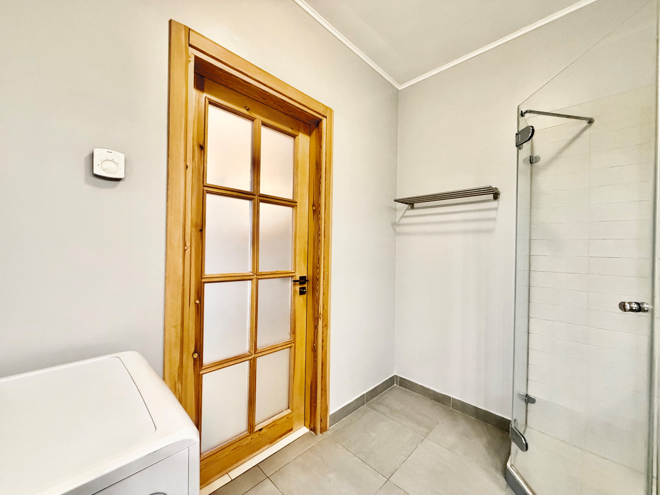 Bute yra visi reikalingiausi baldai: skalbimo mašina, indaplovė, šaldytuvas su šaldikliu, kaitlentė ir t.t.