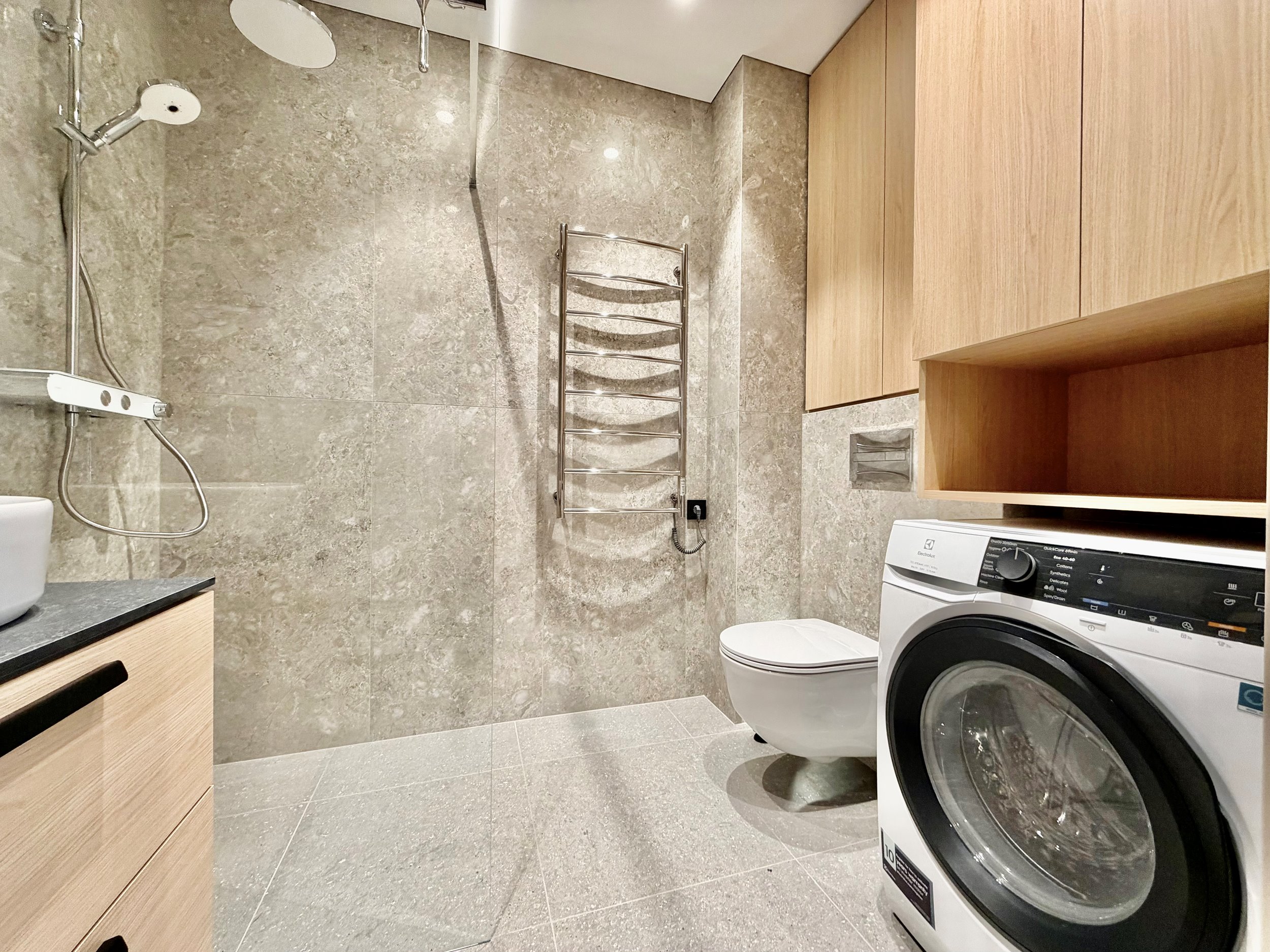 Bute yra visi reikalingiausi baldai: skalbimo mašina su džiovykle, indaplovė, šaldytuvas su šaldikliu, kaitlentė ir t.t.