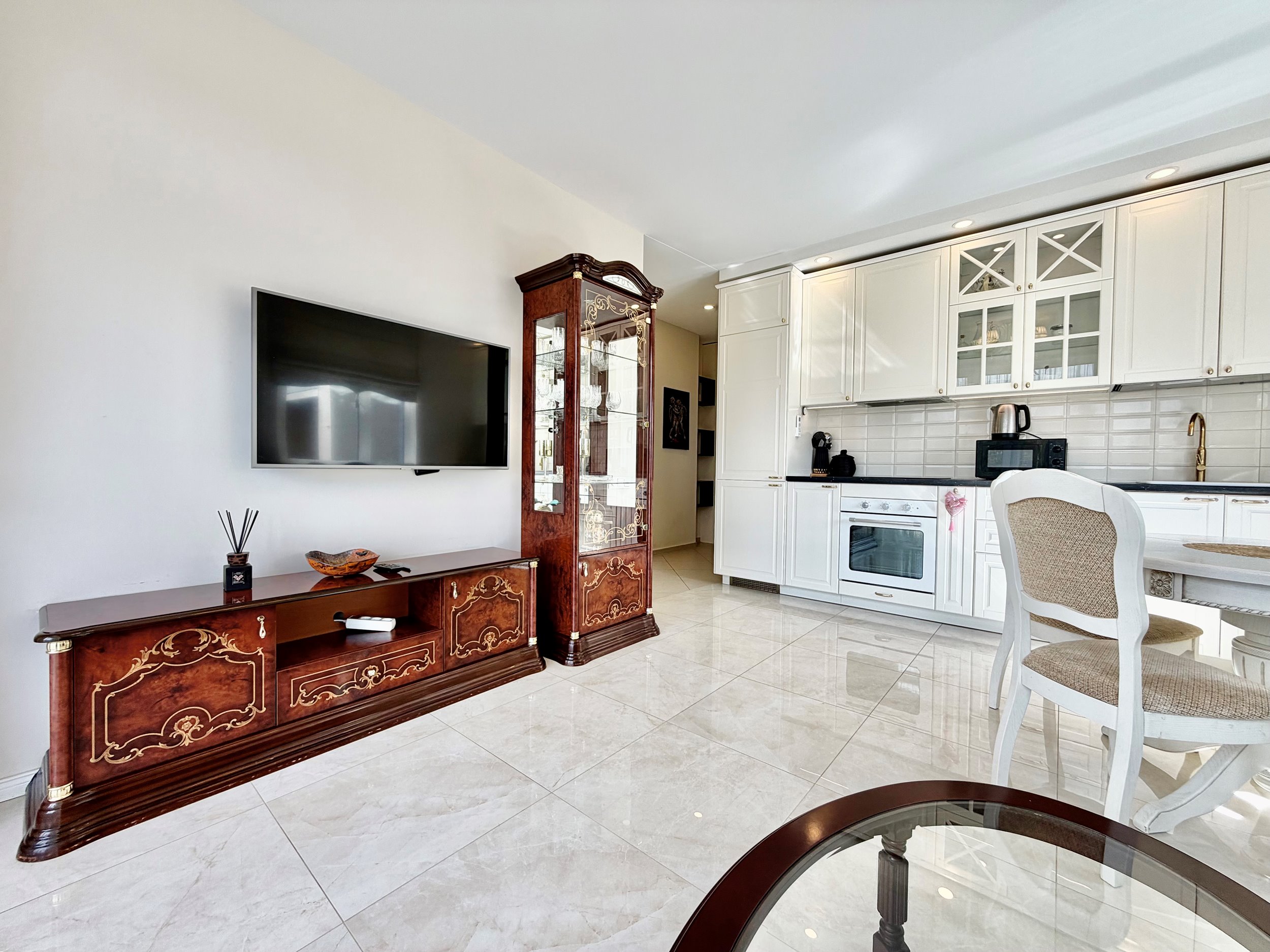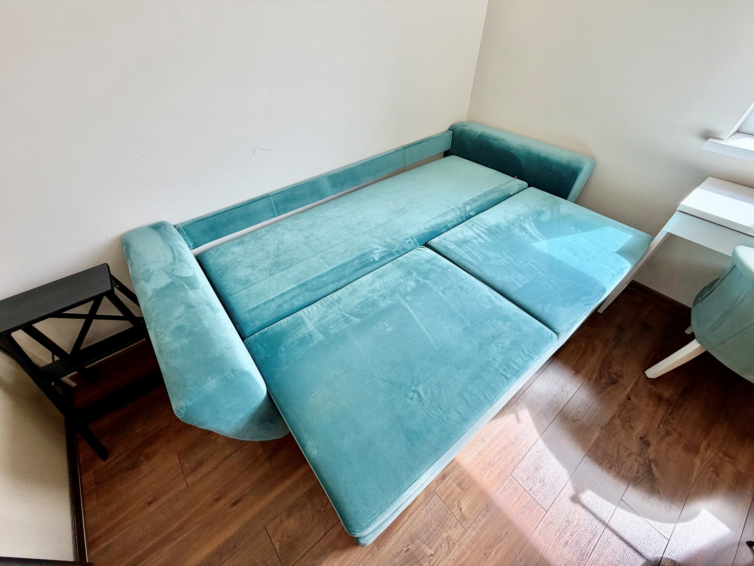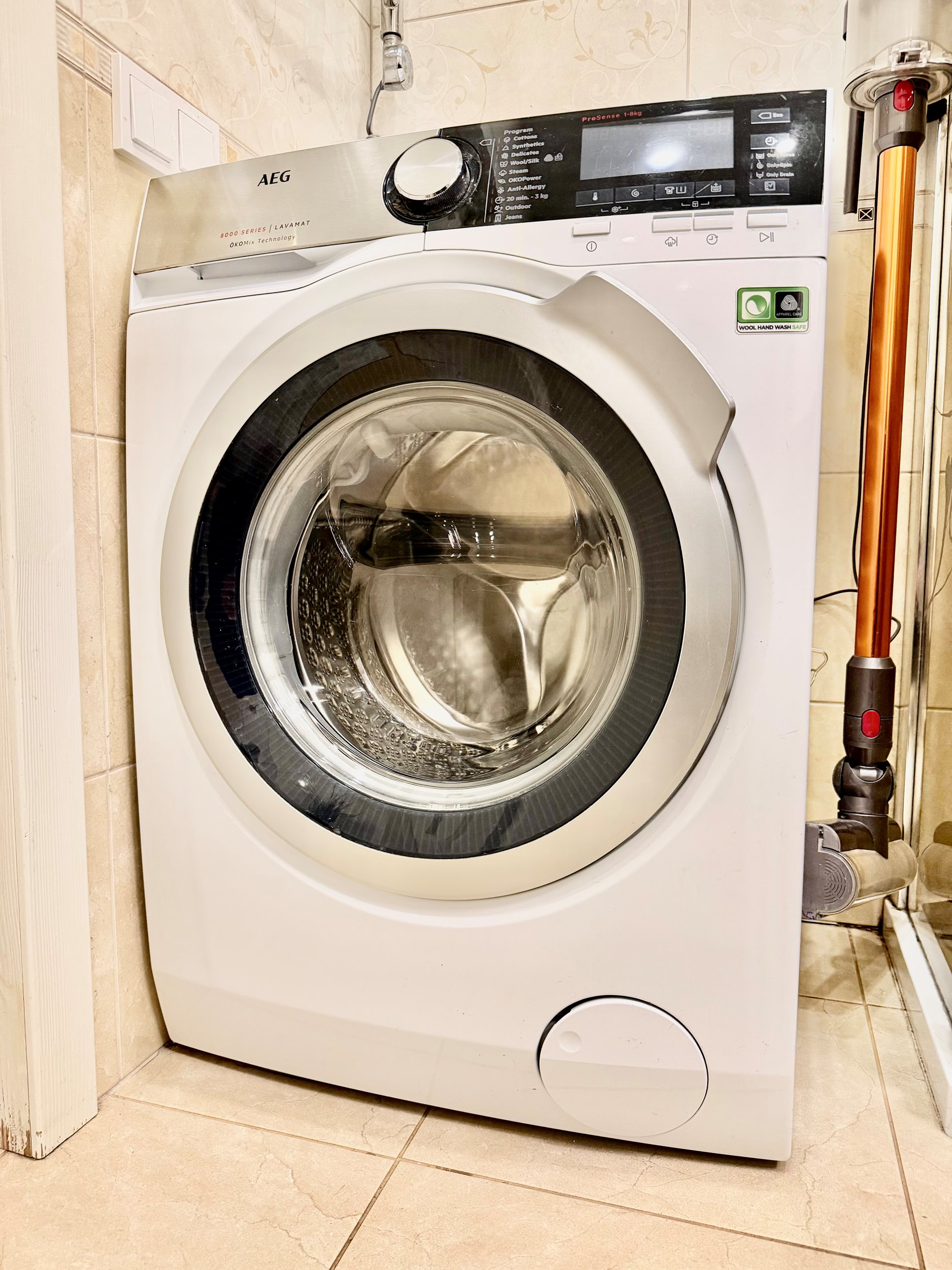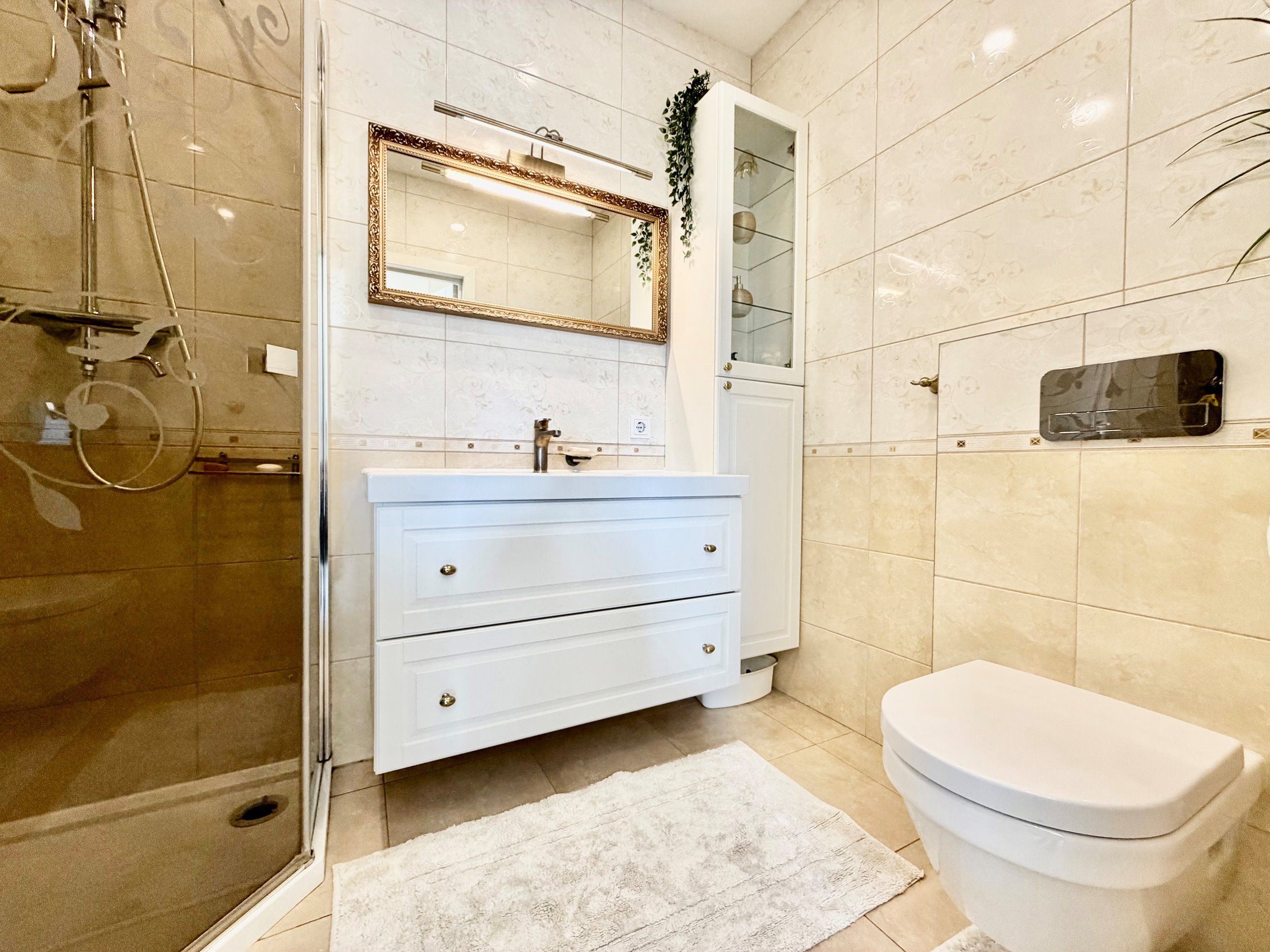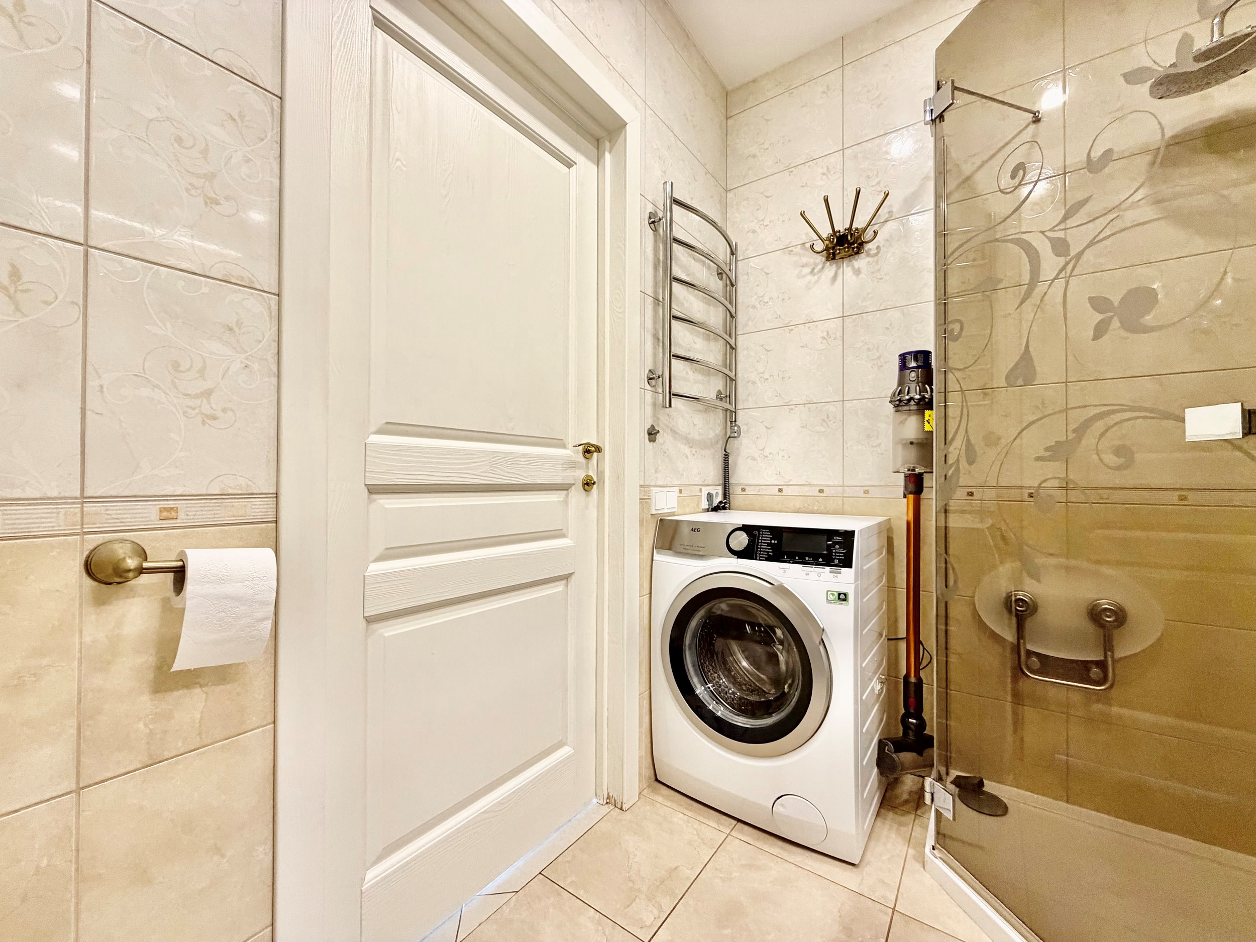 Bute yra visi reikalingiausi baldai: skalbimo mašina, šaldytuvas su šaldikliu, viryklė ir t.t.