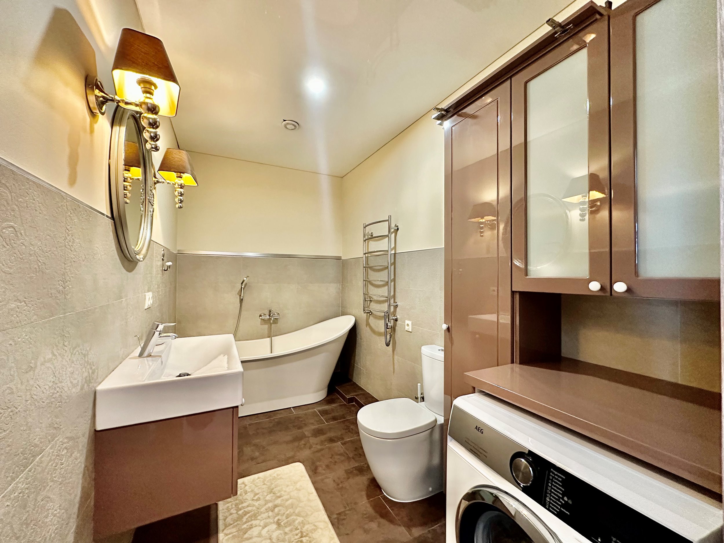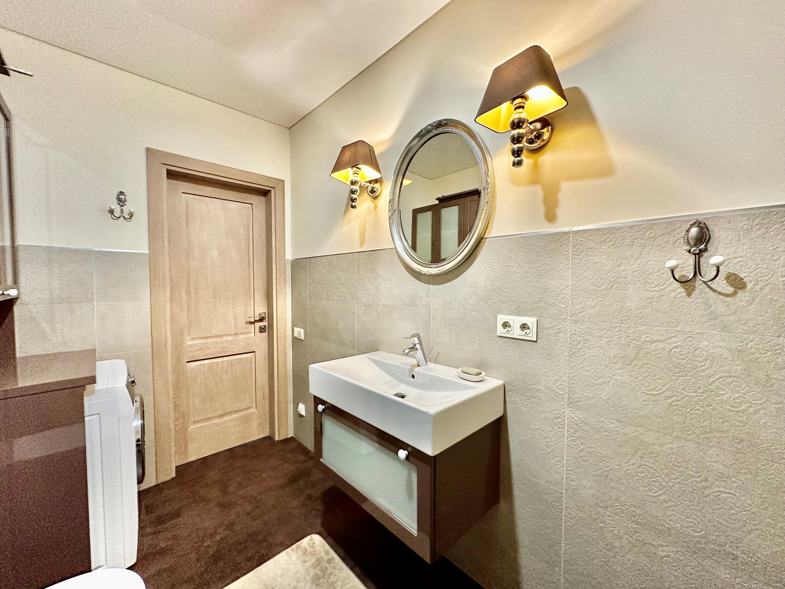 Bute yra visi reikalingiausi baldai: skalbimo mašina, indaplovė, šaldytuvas su šaldikliu, kaitlentė ir t.t.