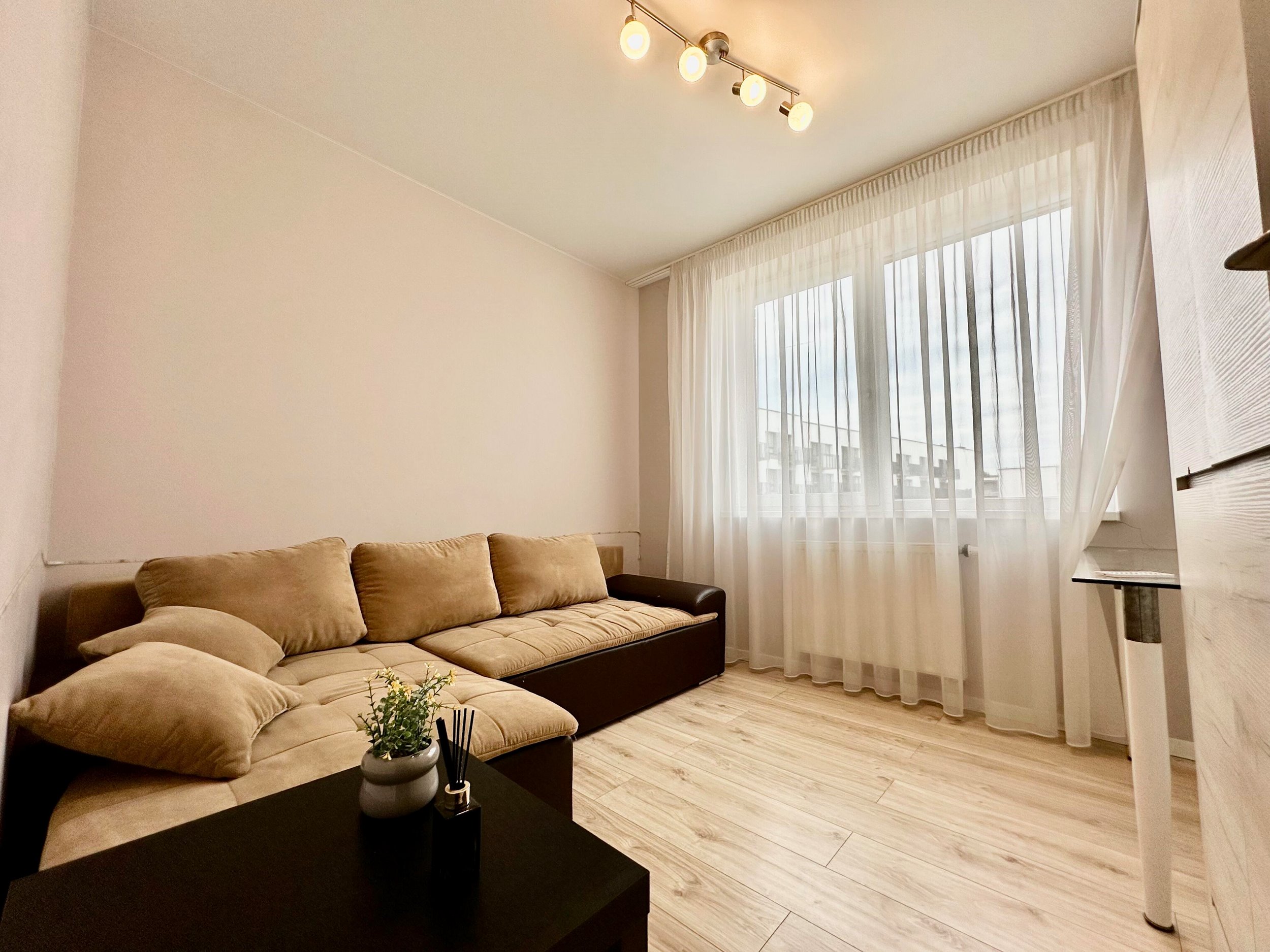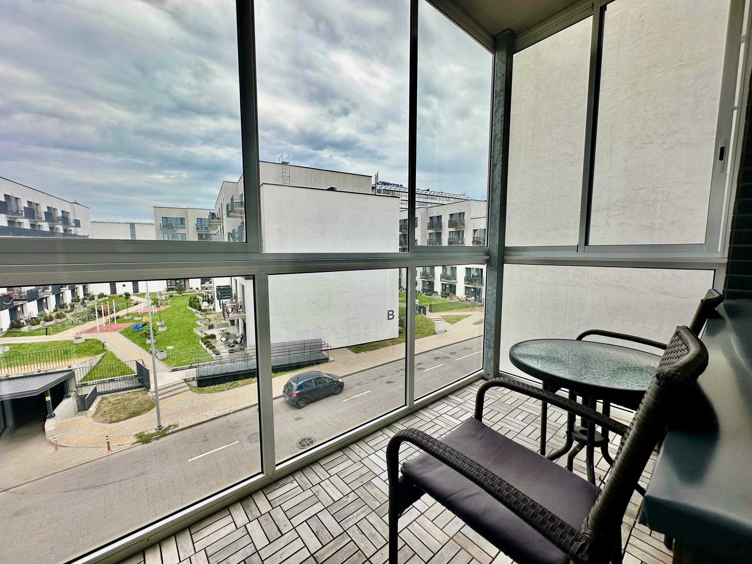 Išplanavimas: svetainė, virtuvė, balkonas, 2 miegamieji, tualetas su vonia.