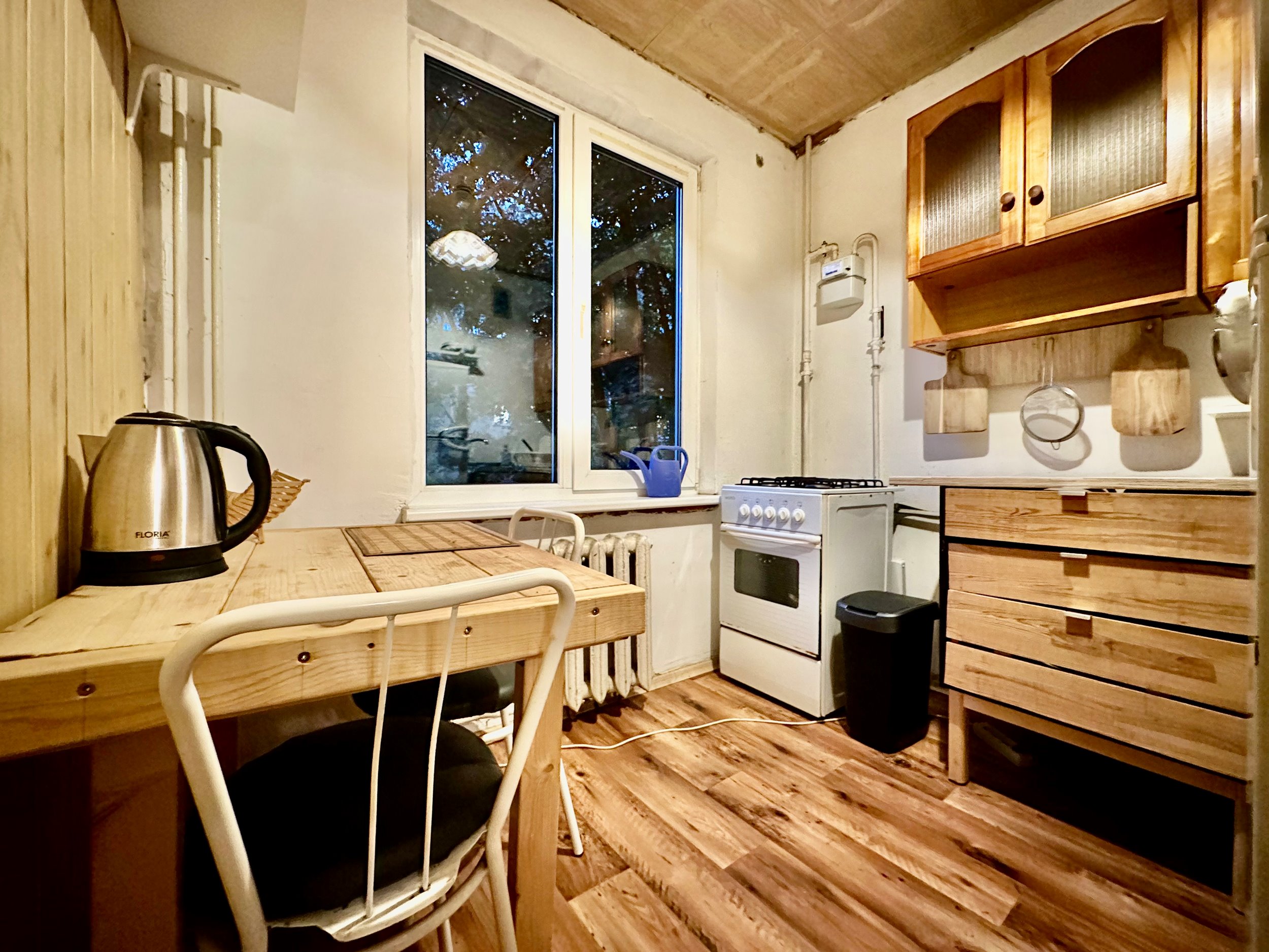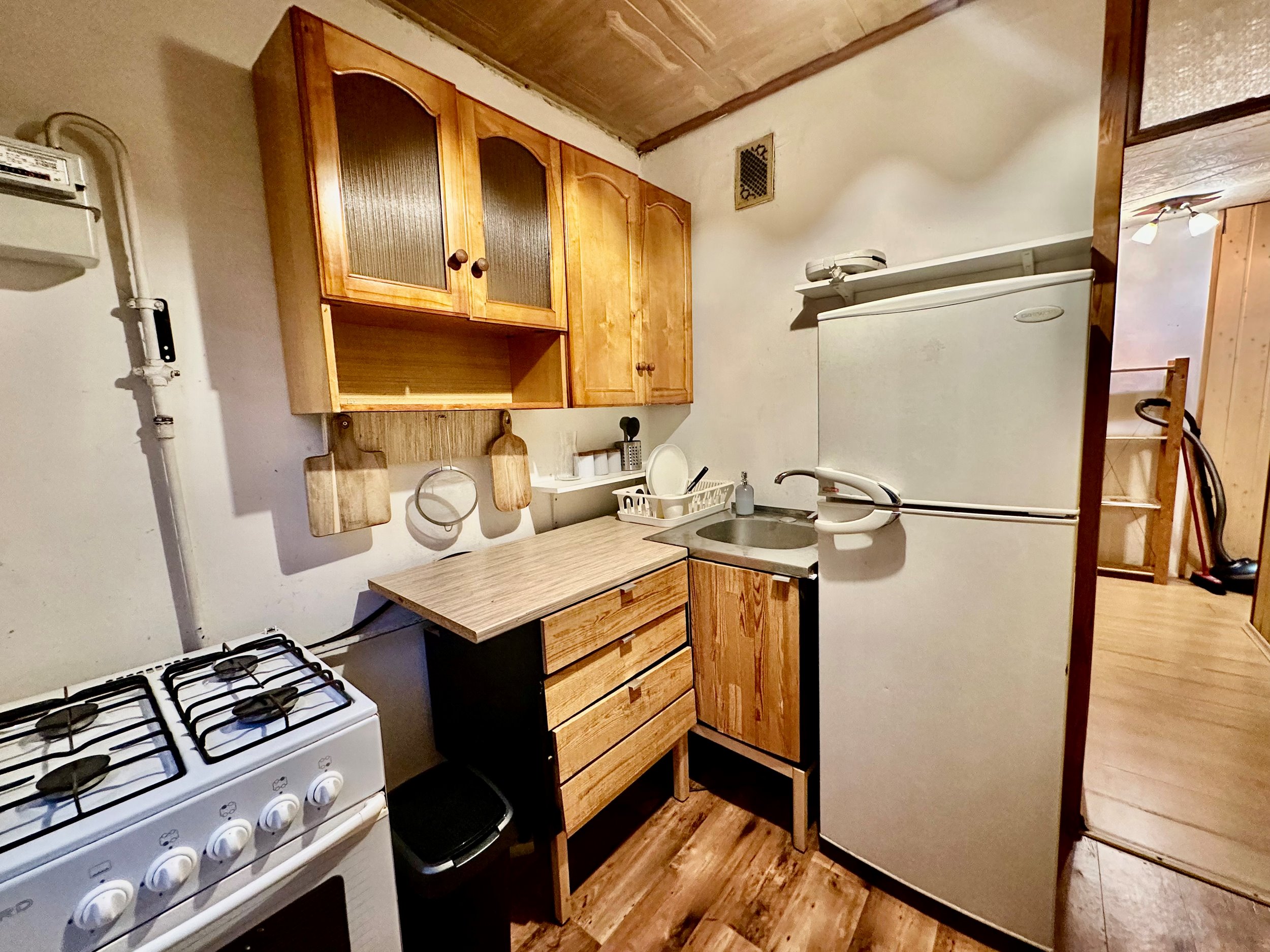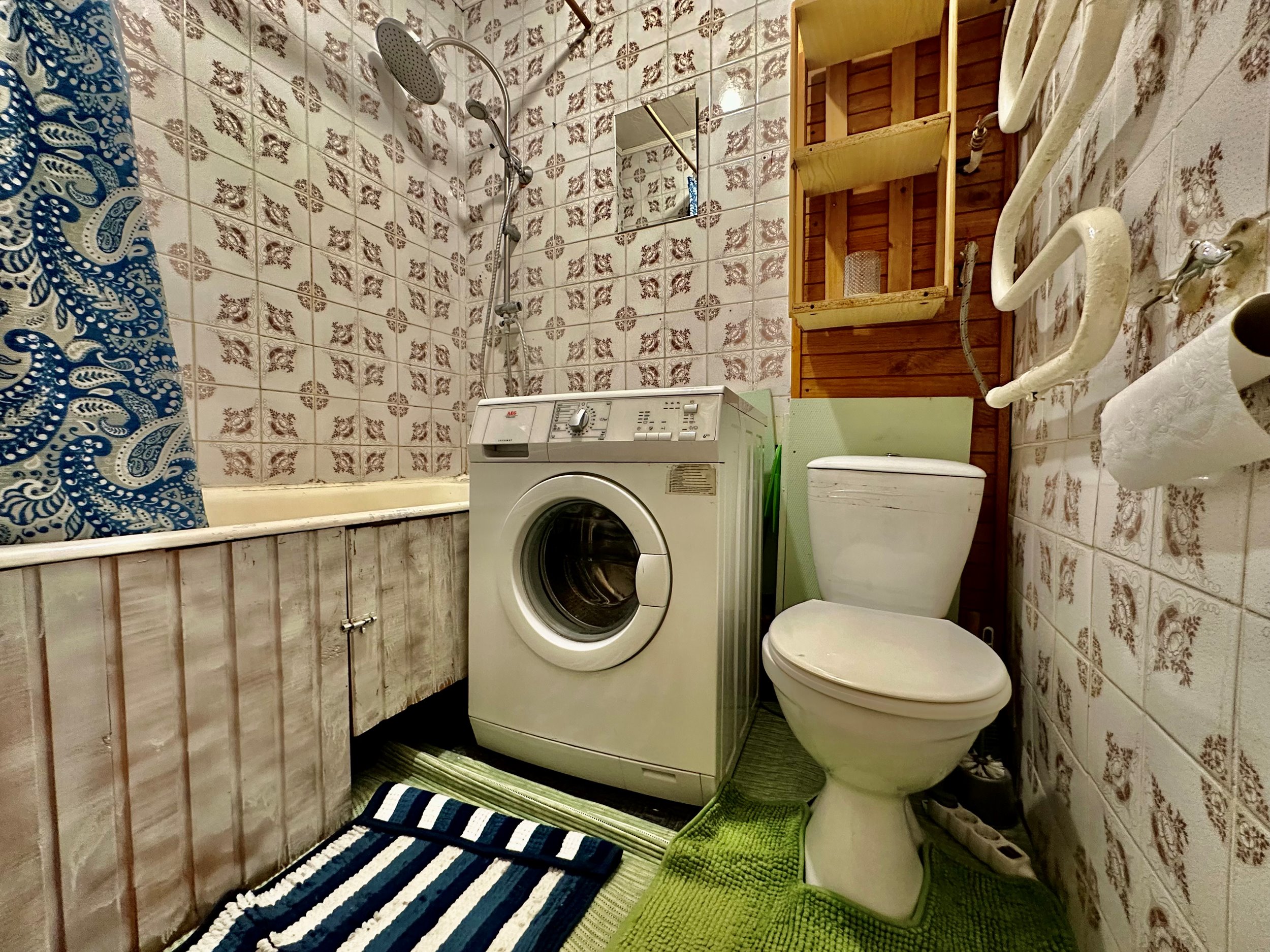 Bute yra visi reikalingiausi baldai: skalbimo mašina, šaldytuvas su šaldikliu, viryklė ir t.t.