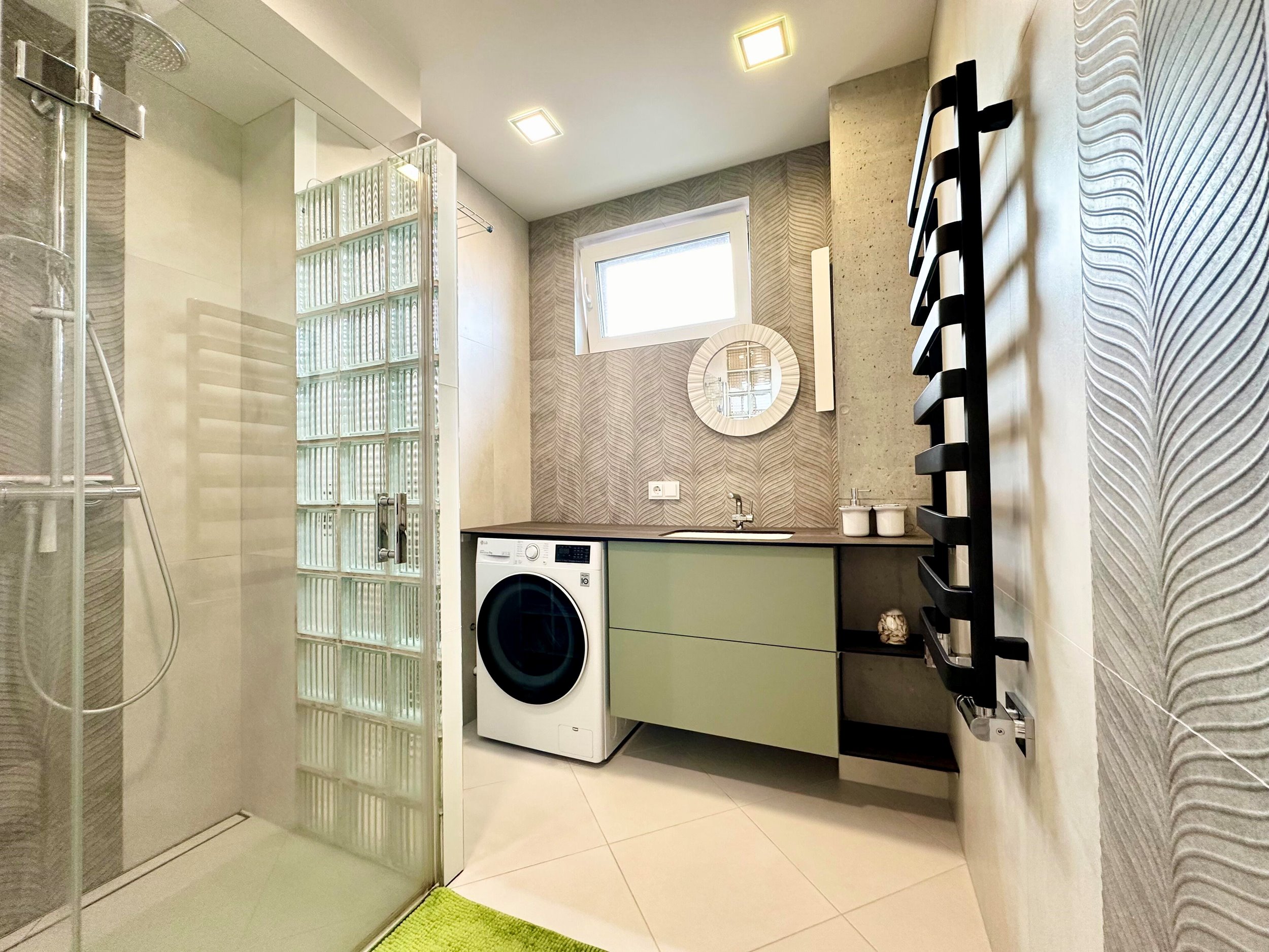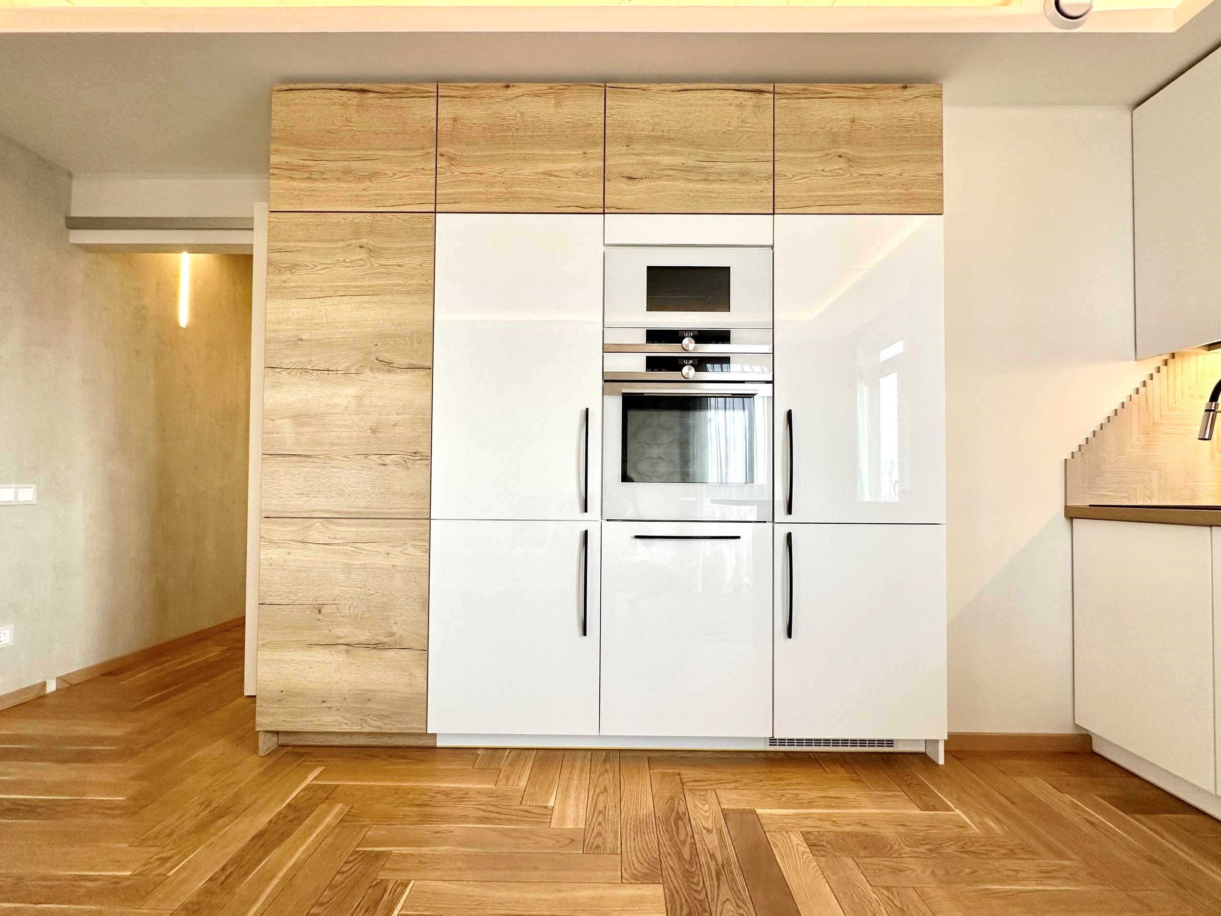 Bute yra visi reikalingiausi baldai: skalbimo mašina, indaplovė, šaldytuvas su šaldikliu, kaitlentė, orkaitė ir t.t.