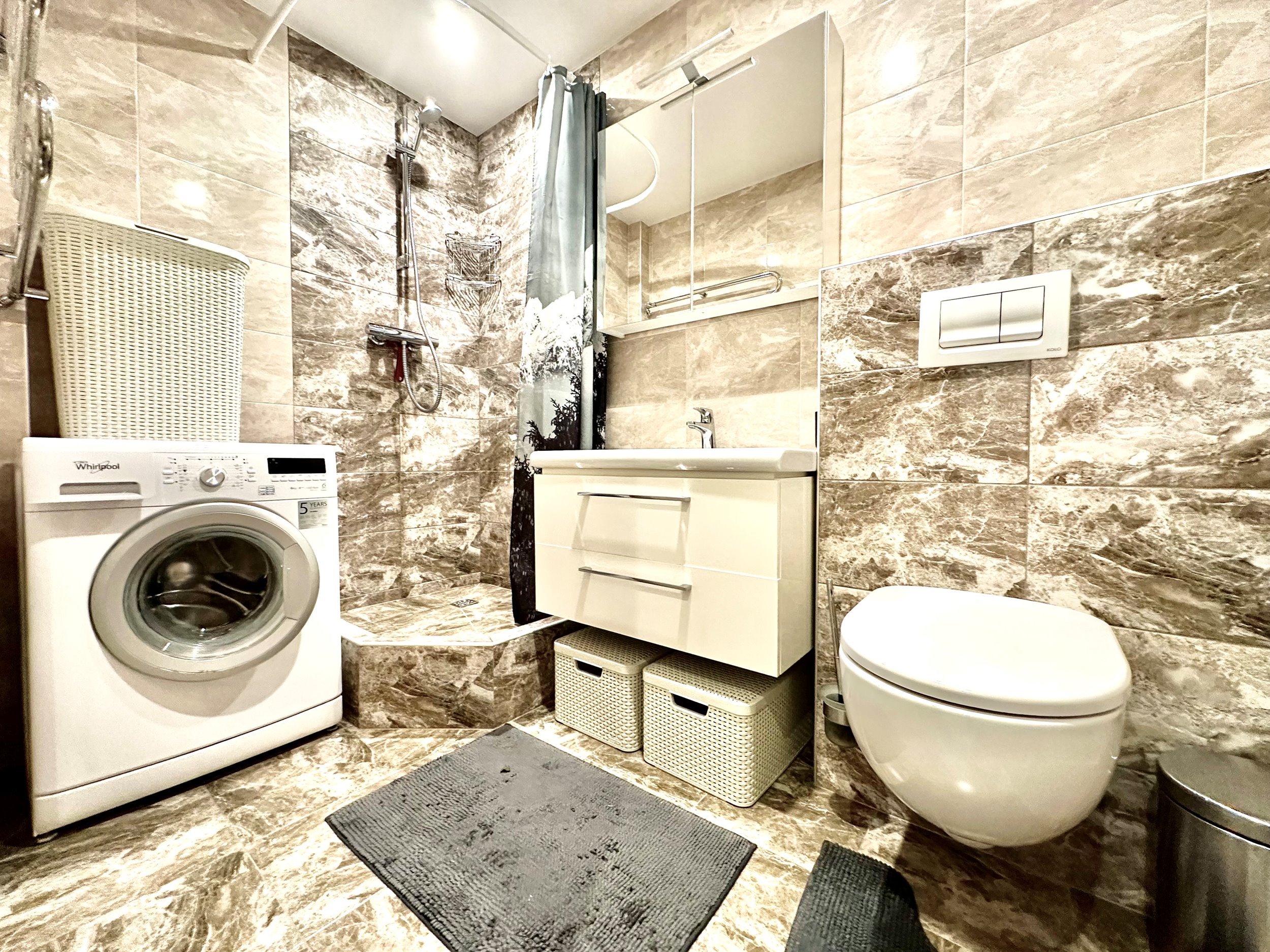 Bute yra visi reikalingiausi baldai: skalbimo mašina, šaldytuvas su šaldikliu, kaitlentė ir t.t.