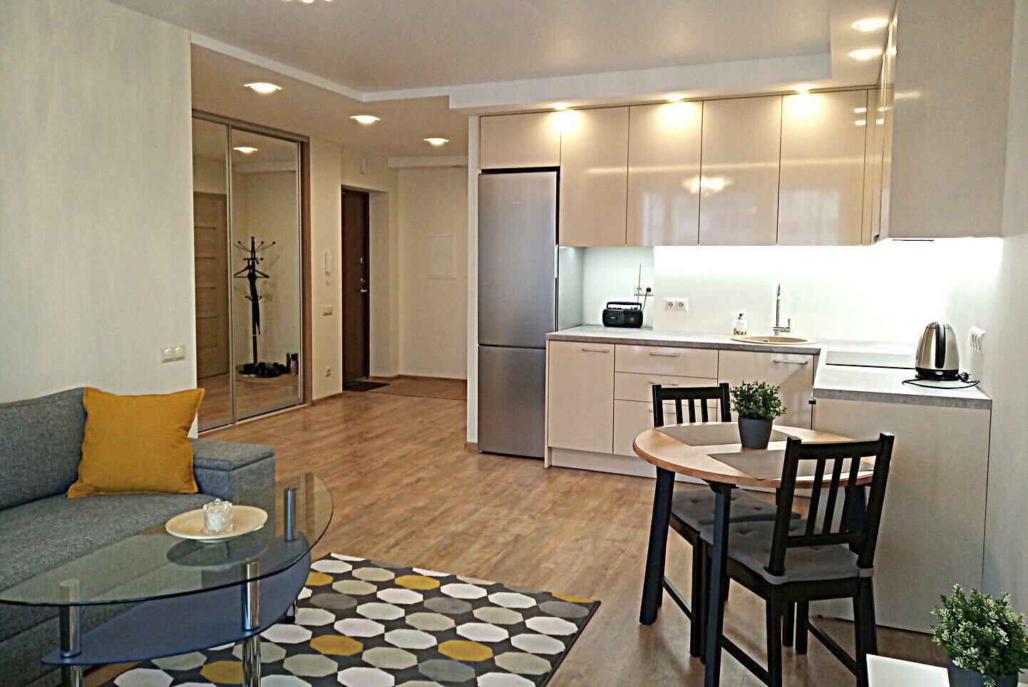 - Visa reikalinga buitinė technika patogiam gyvenimui (viryklė, šaldytuvas, gartraukis, skalbimo mašina, mikrobangų krosnelė);