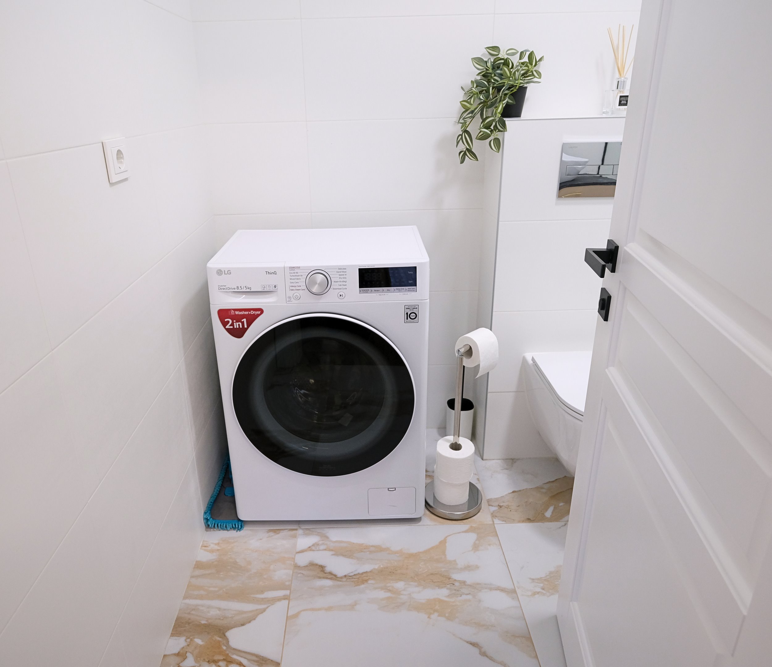 Bute yra visi reikalingiausi baldai, sofa-lova, skalbimo mašina su džiovykle, indaplovė, šaldytuvas su šaldikliu, viryklė ir t.t.