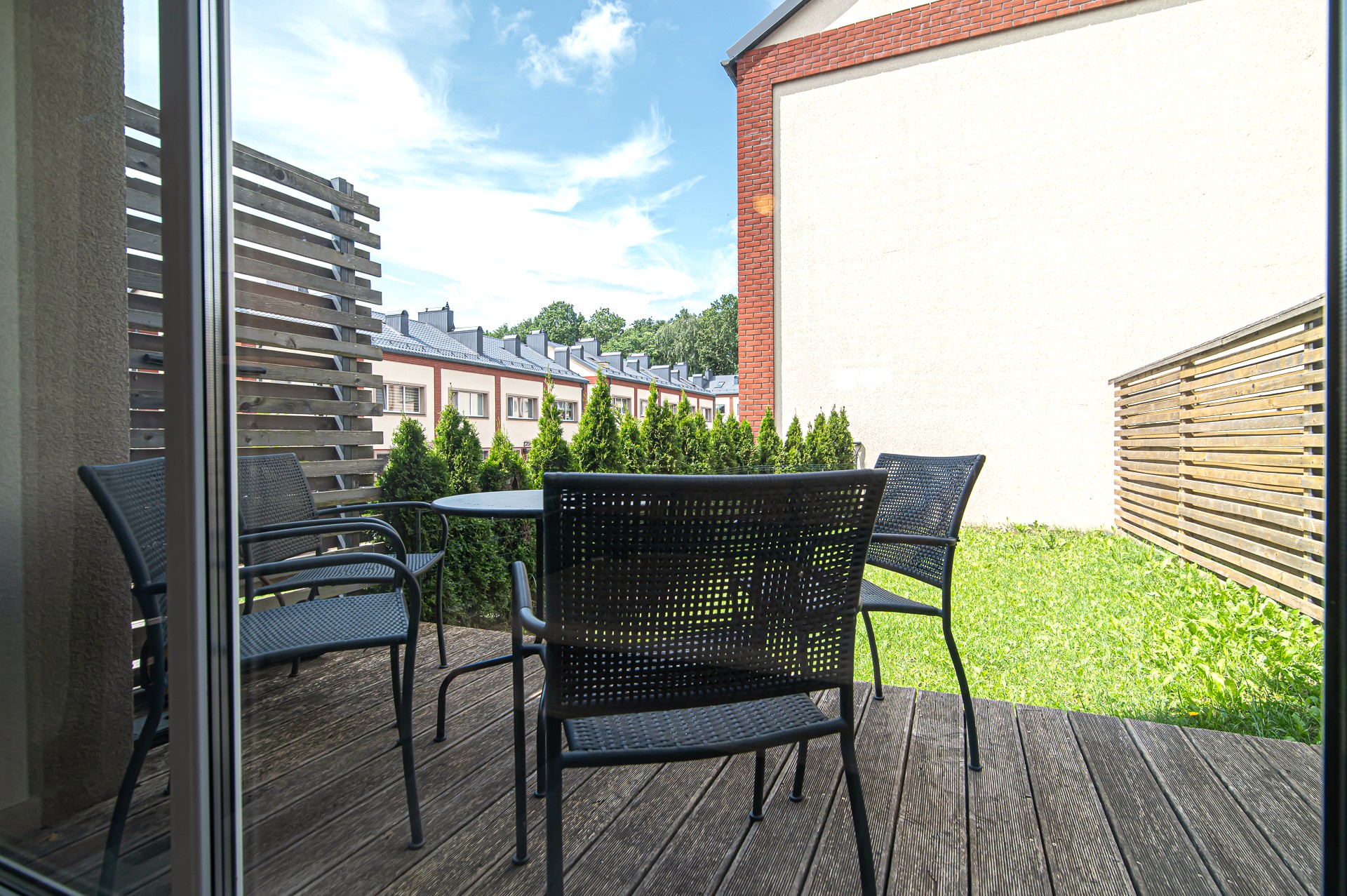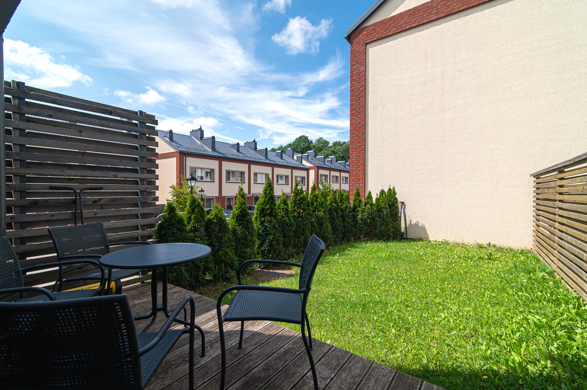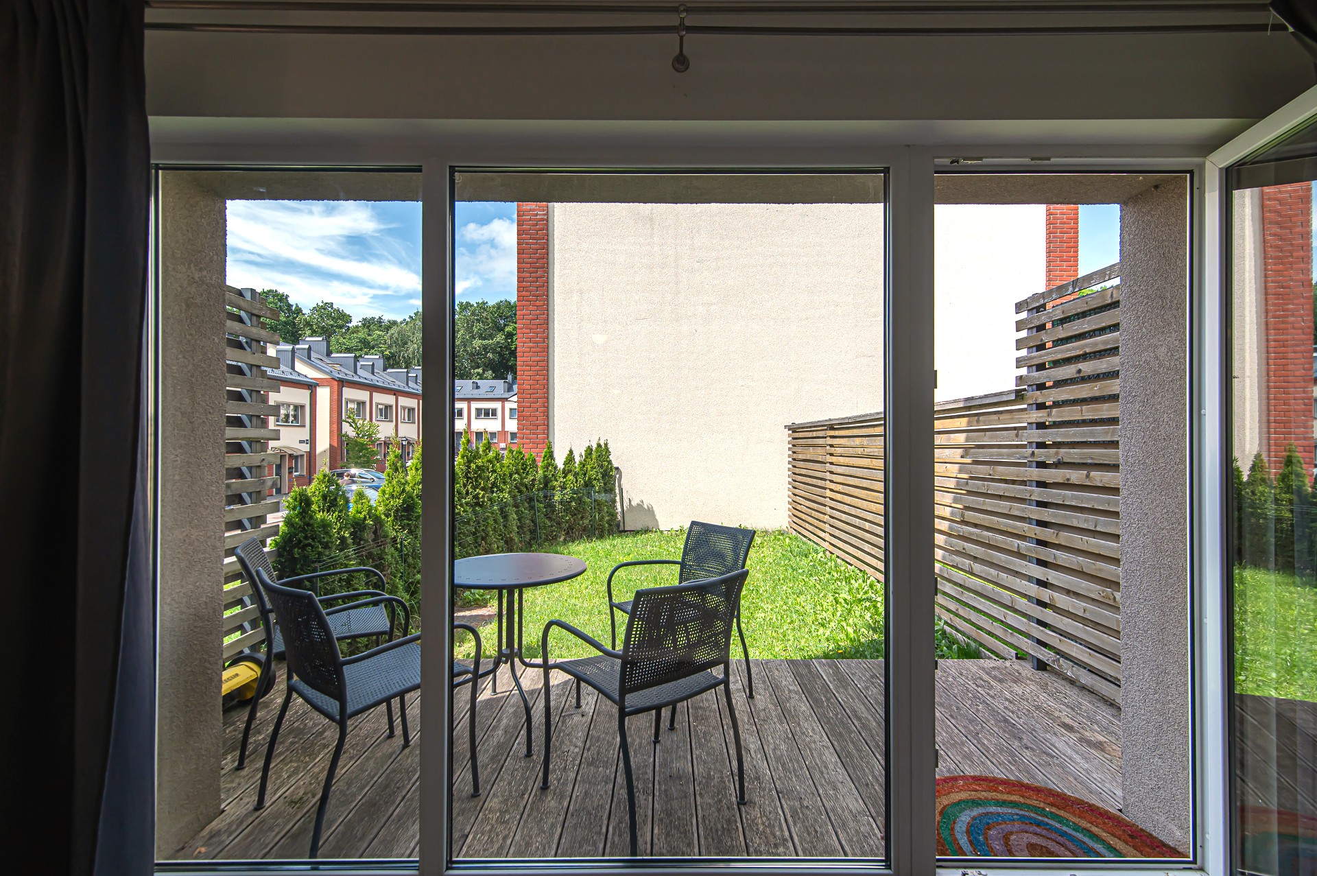 Įrengtas vidinis kiemas su vaikų žaidimo aikštele ir poilsio zona