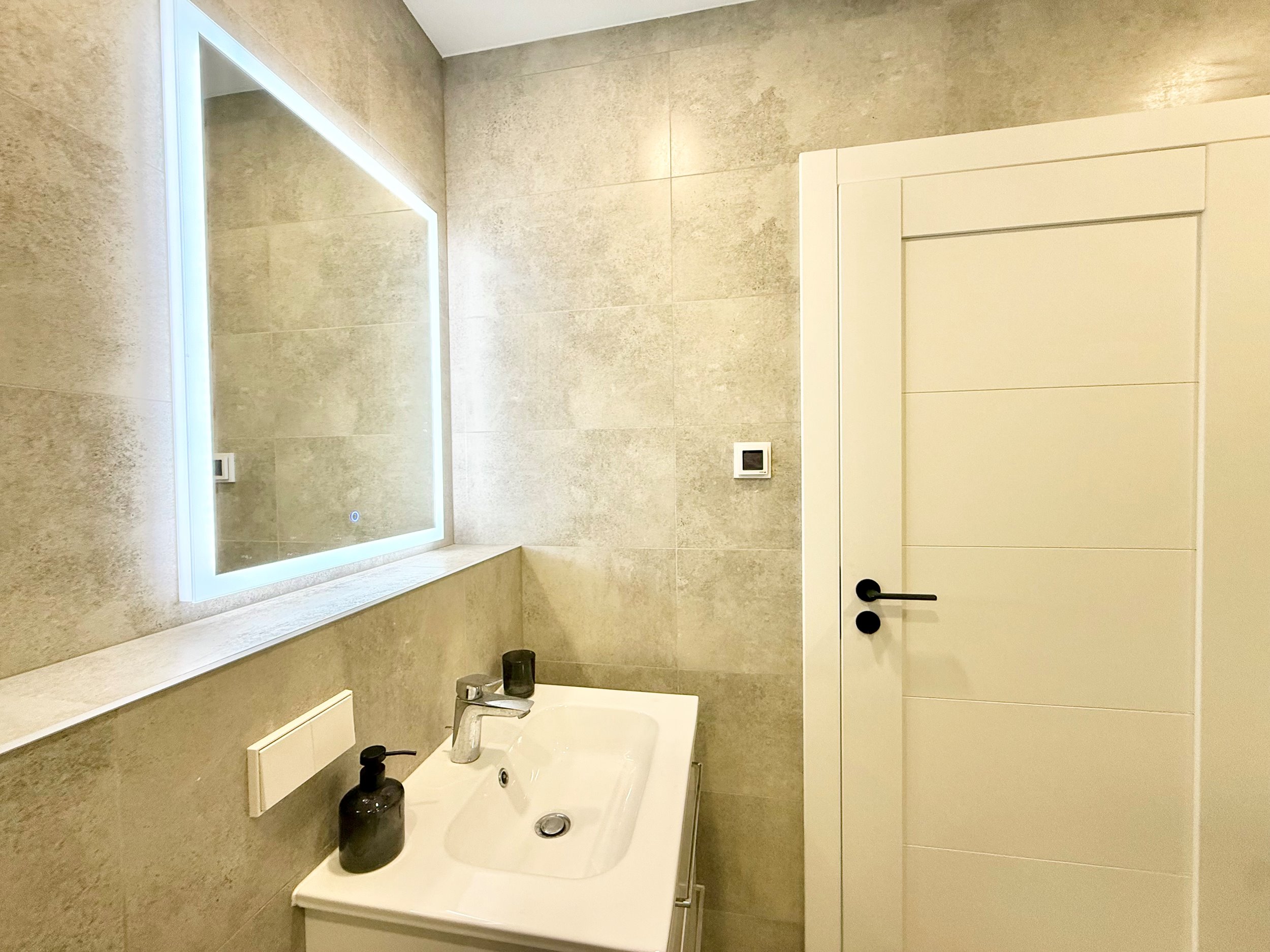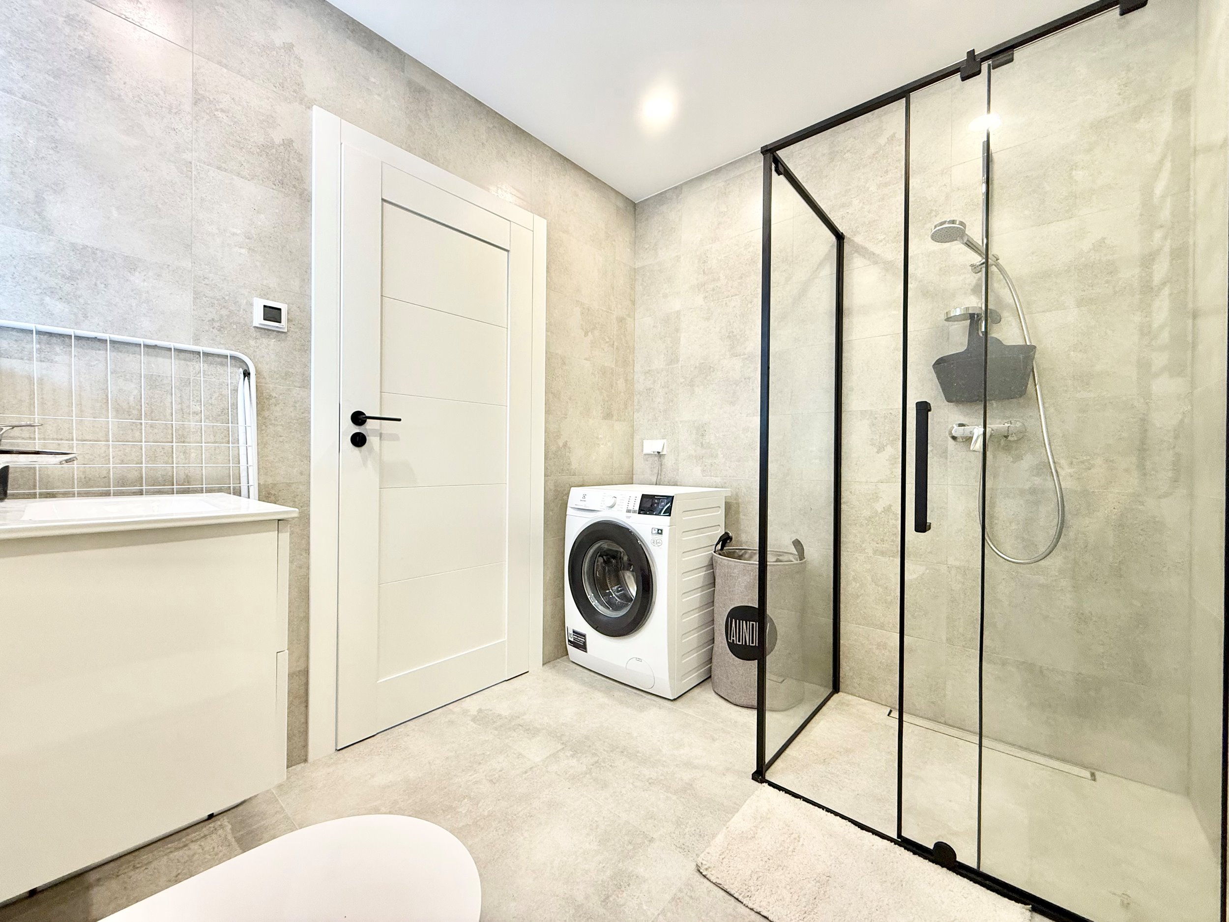 Vonioje šildomos grindys.