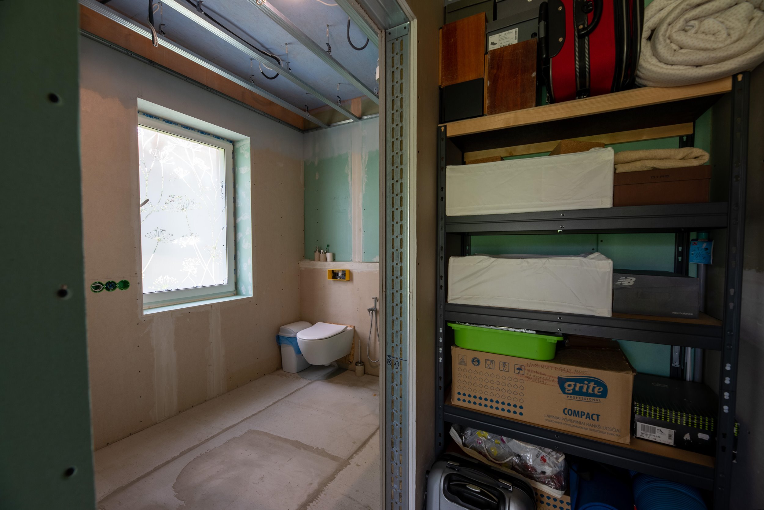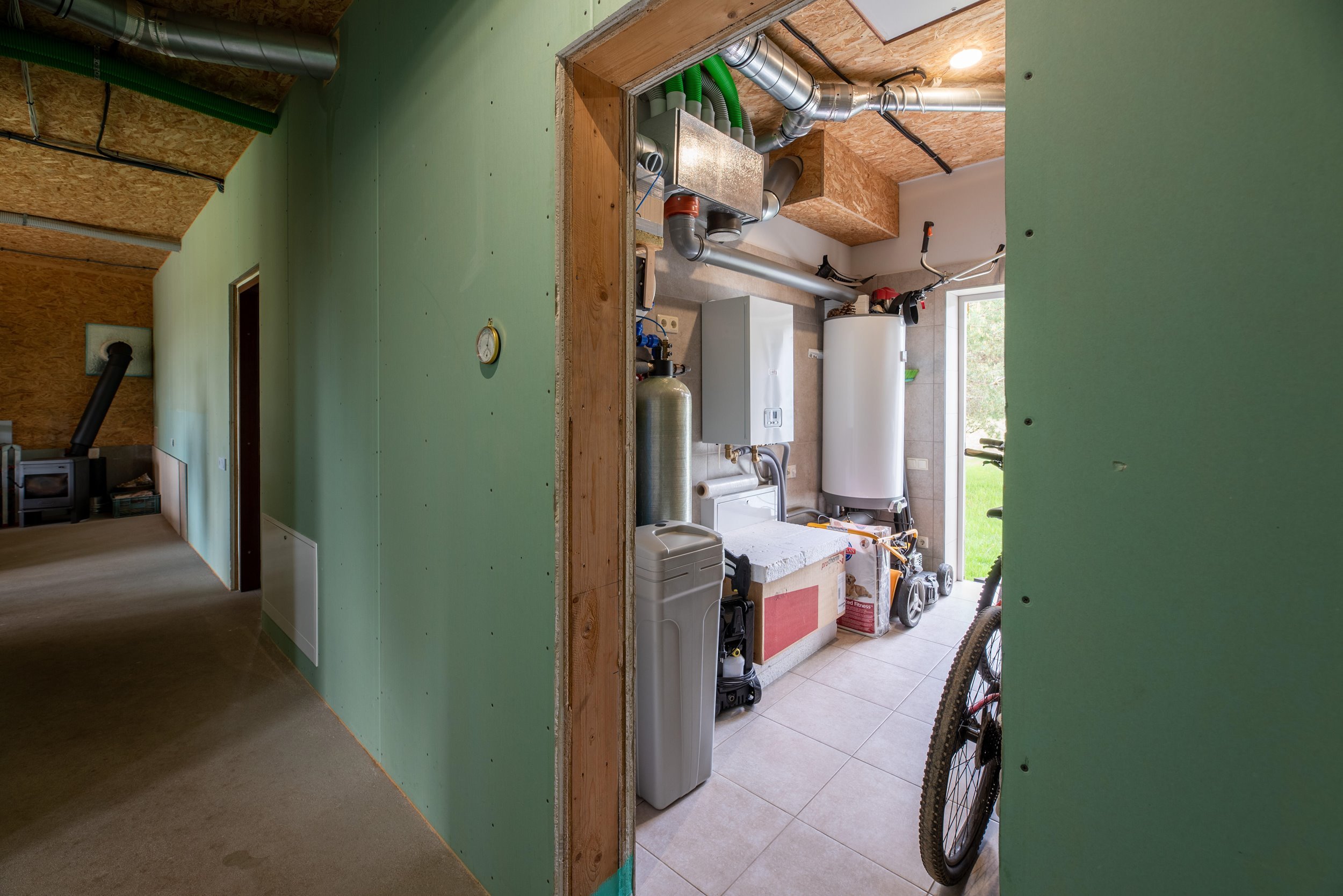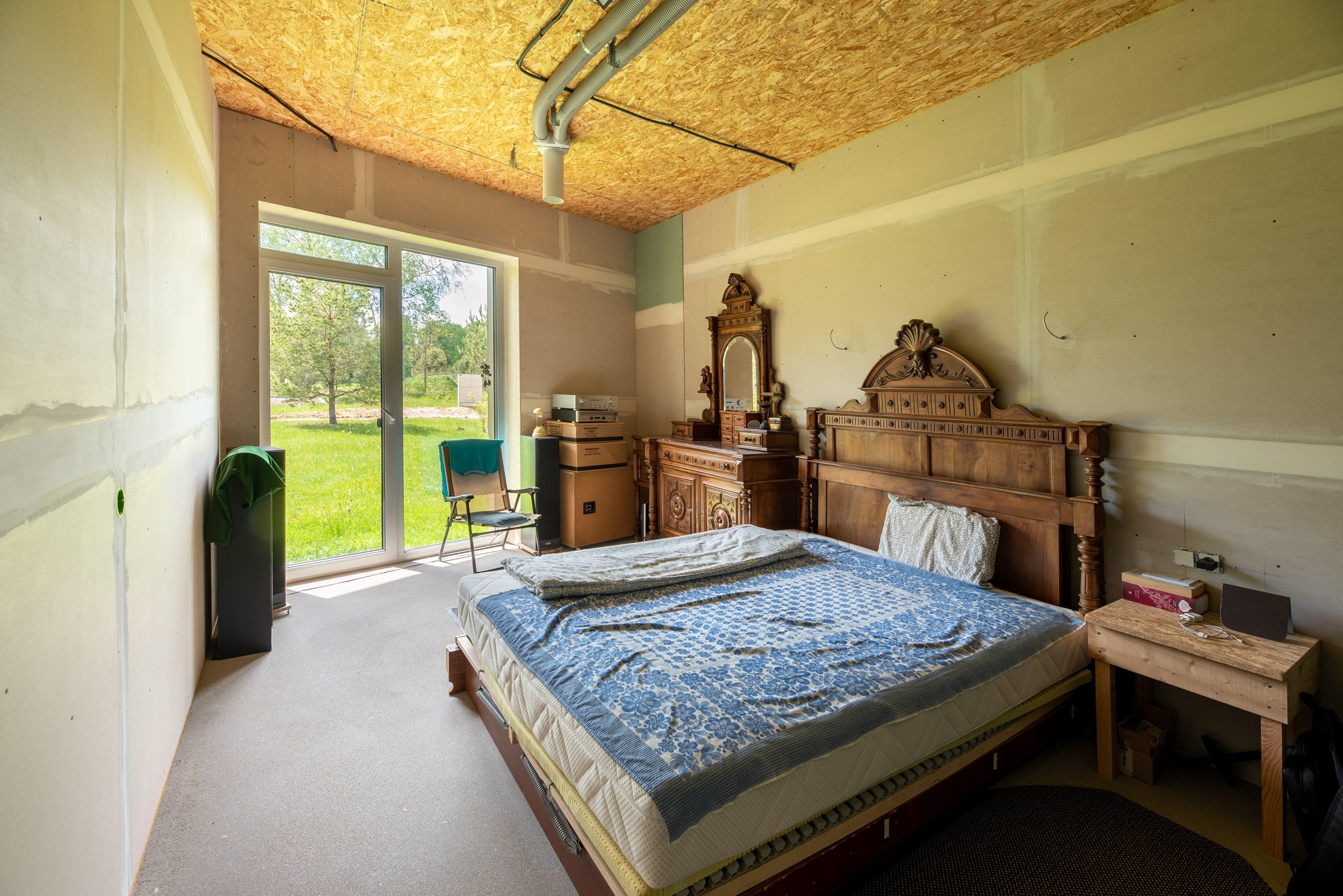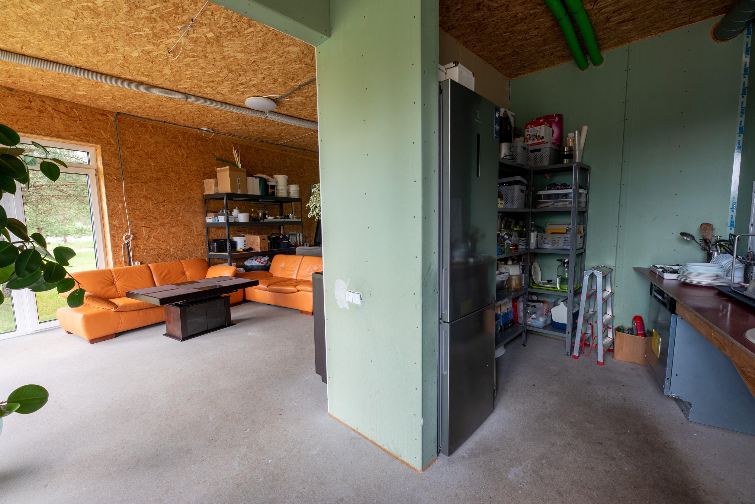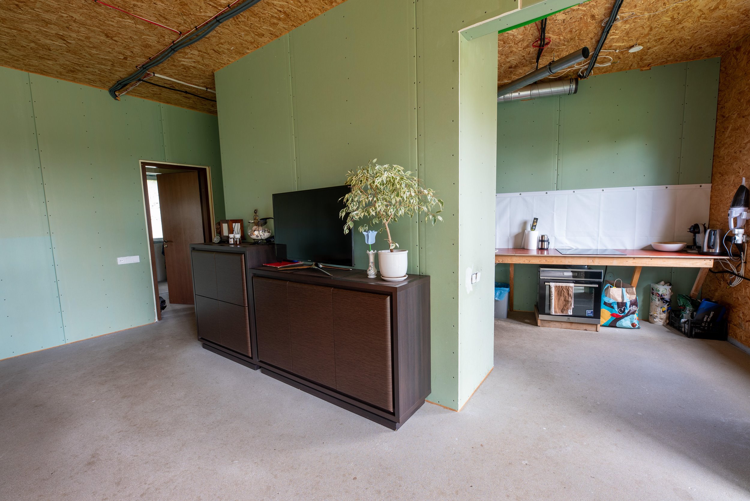 Vidaus apdailos lygis (dvi pilnai užbaigtos patalpos, išvedžiotos visos komunikacijos + silpnos srovės, (JAU DABAR GALIMA GYVENTI IR PALAIPSNIUI KURTIS, ŠEIMININKAI GYVENA)
