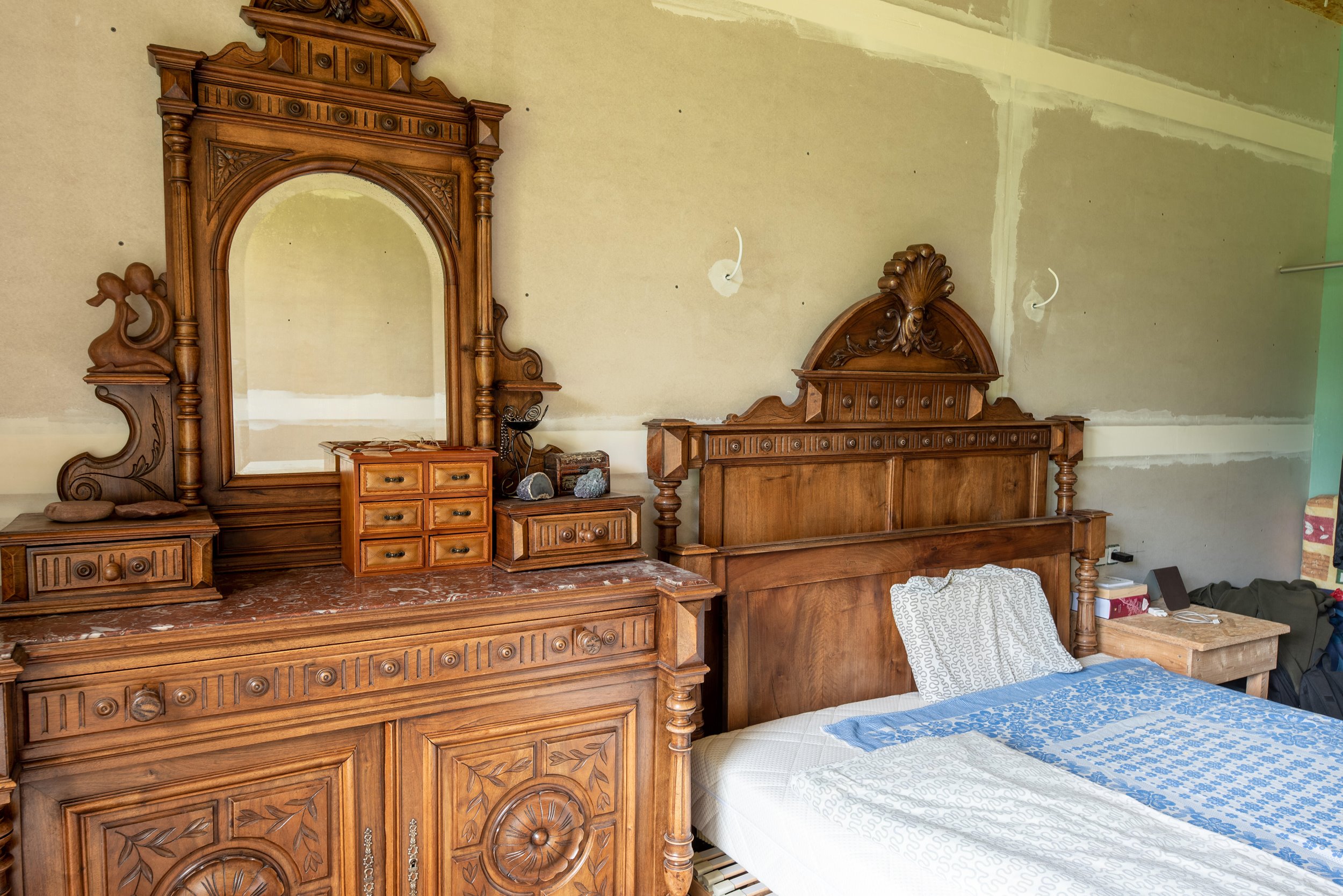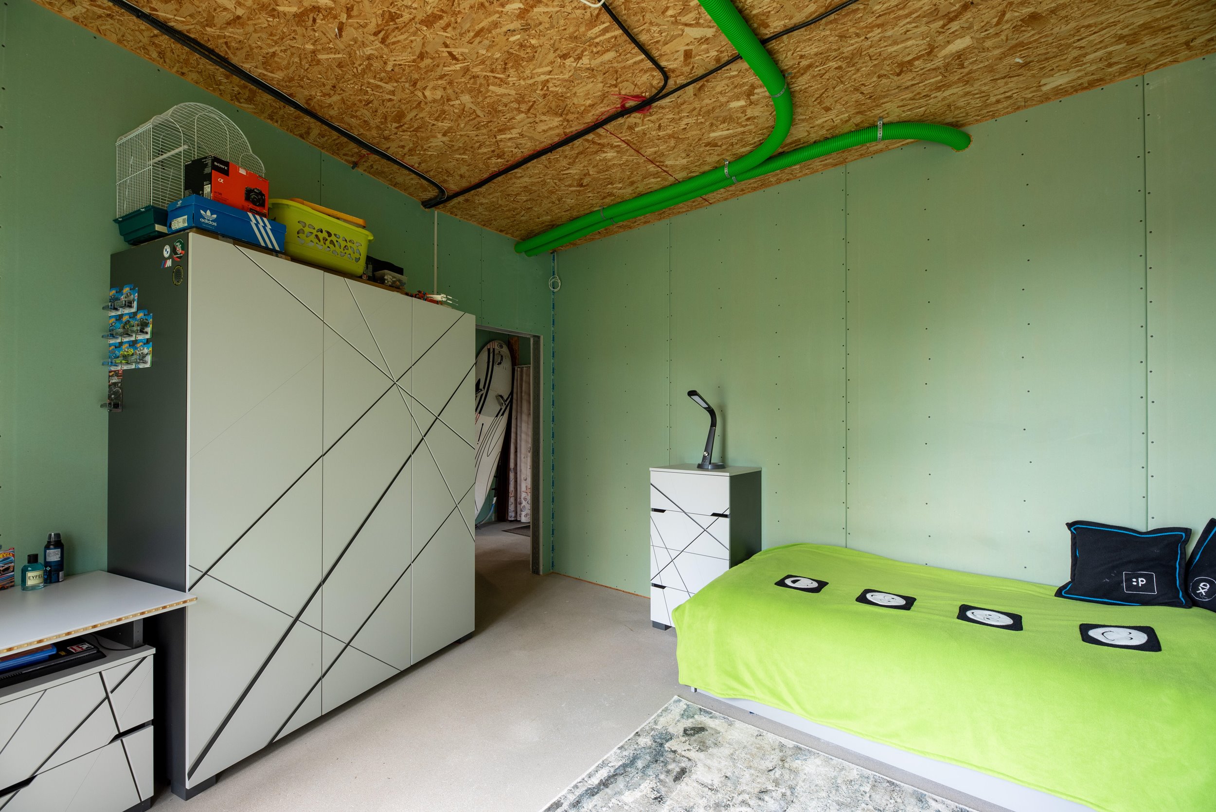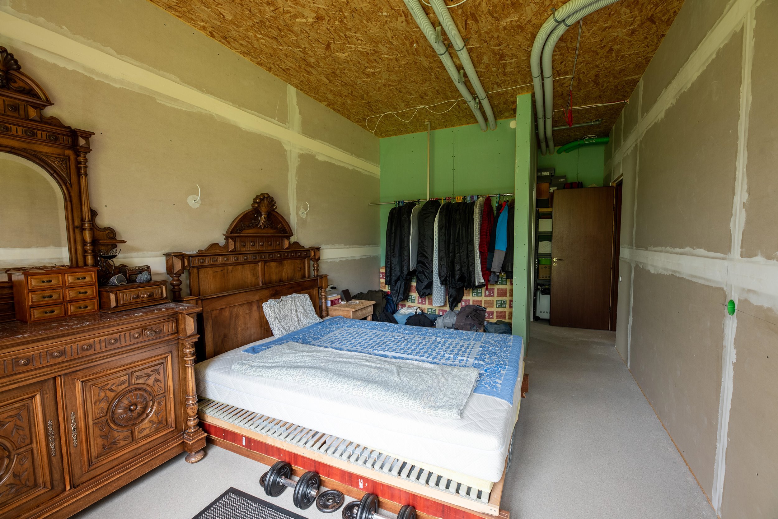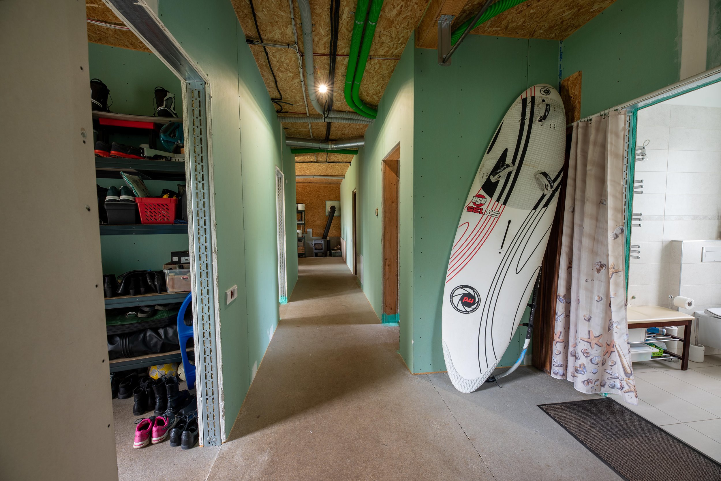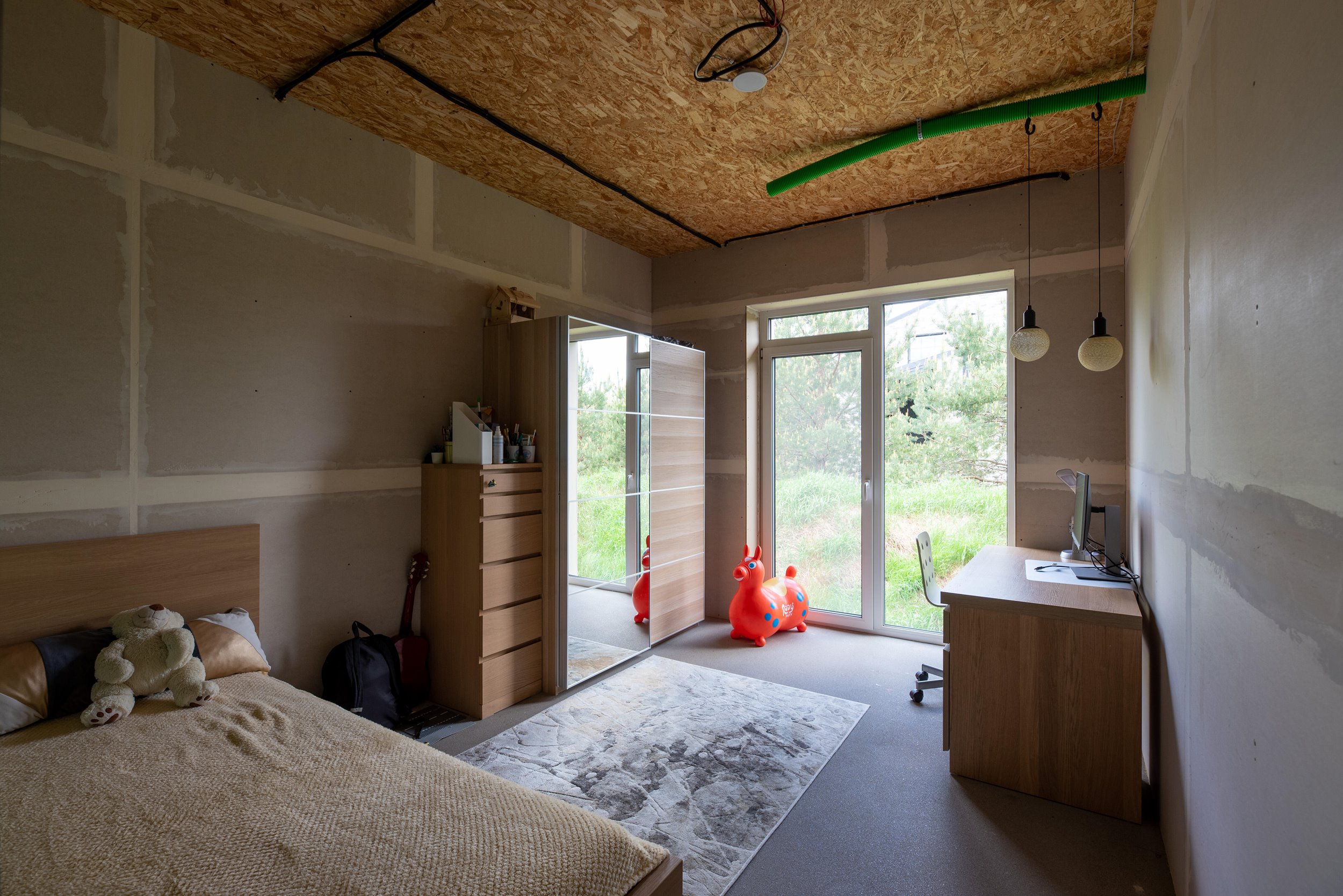 Vidaus apdailos lygis (dvi pilnai užbaigtos patalpos, išvedžiotos visos komunikacijos + silpnos srovės, (JAU DABAR GALIMA GYVENTI IR PALAIPSNIUI KURTIS, ŠEIMININKAI GYVENA)
