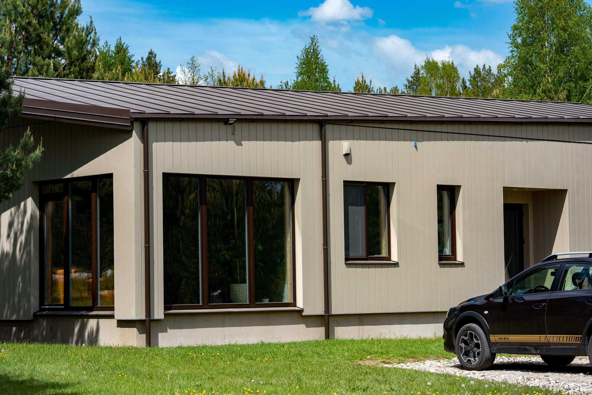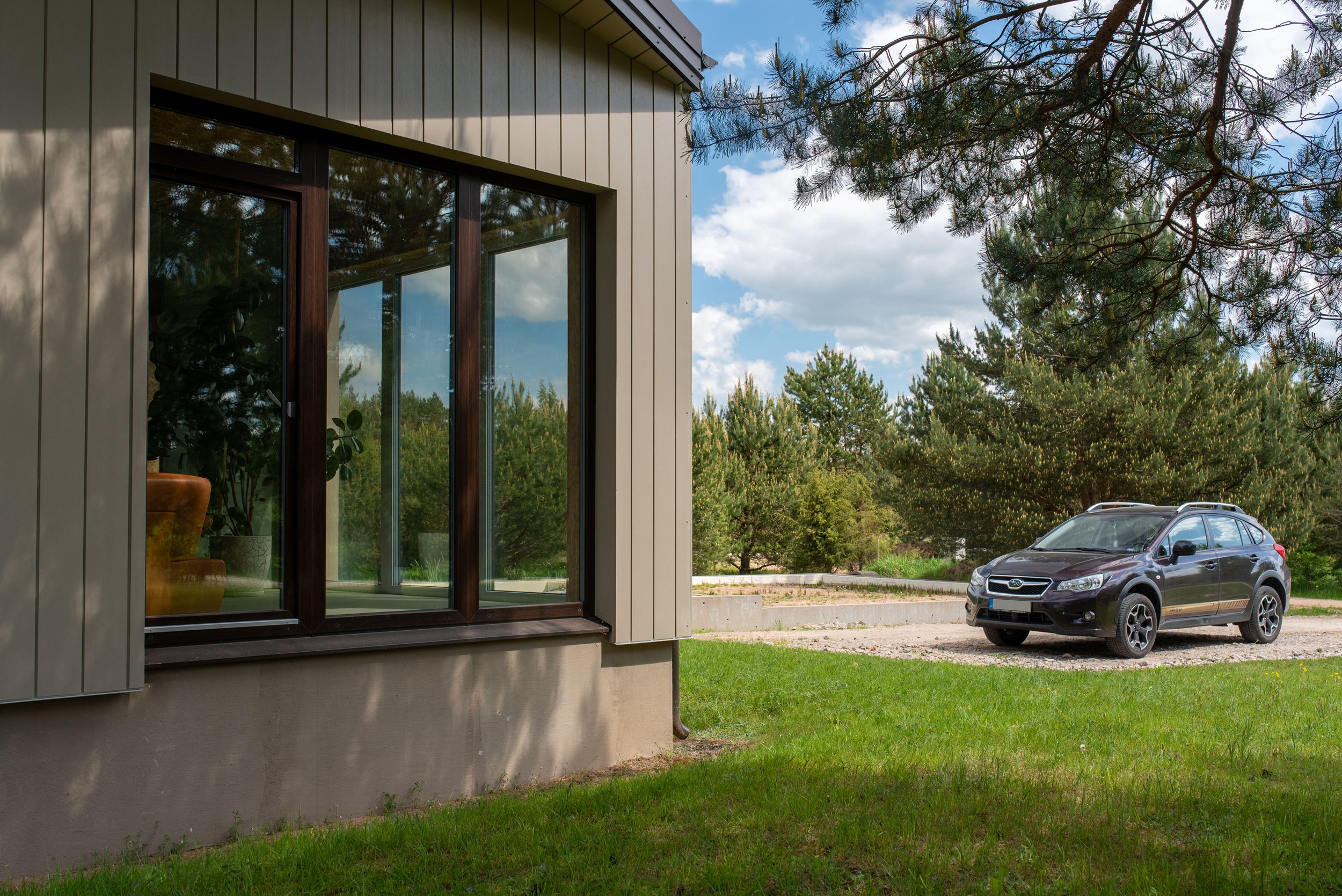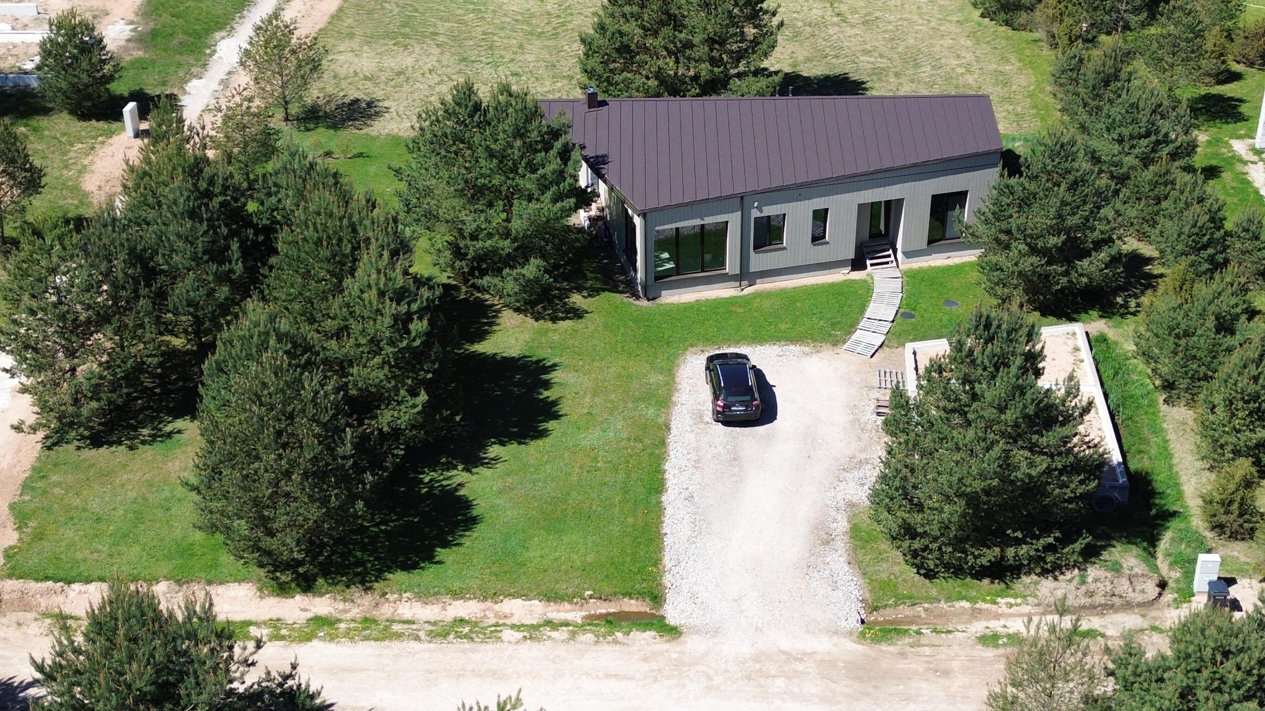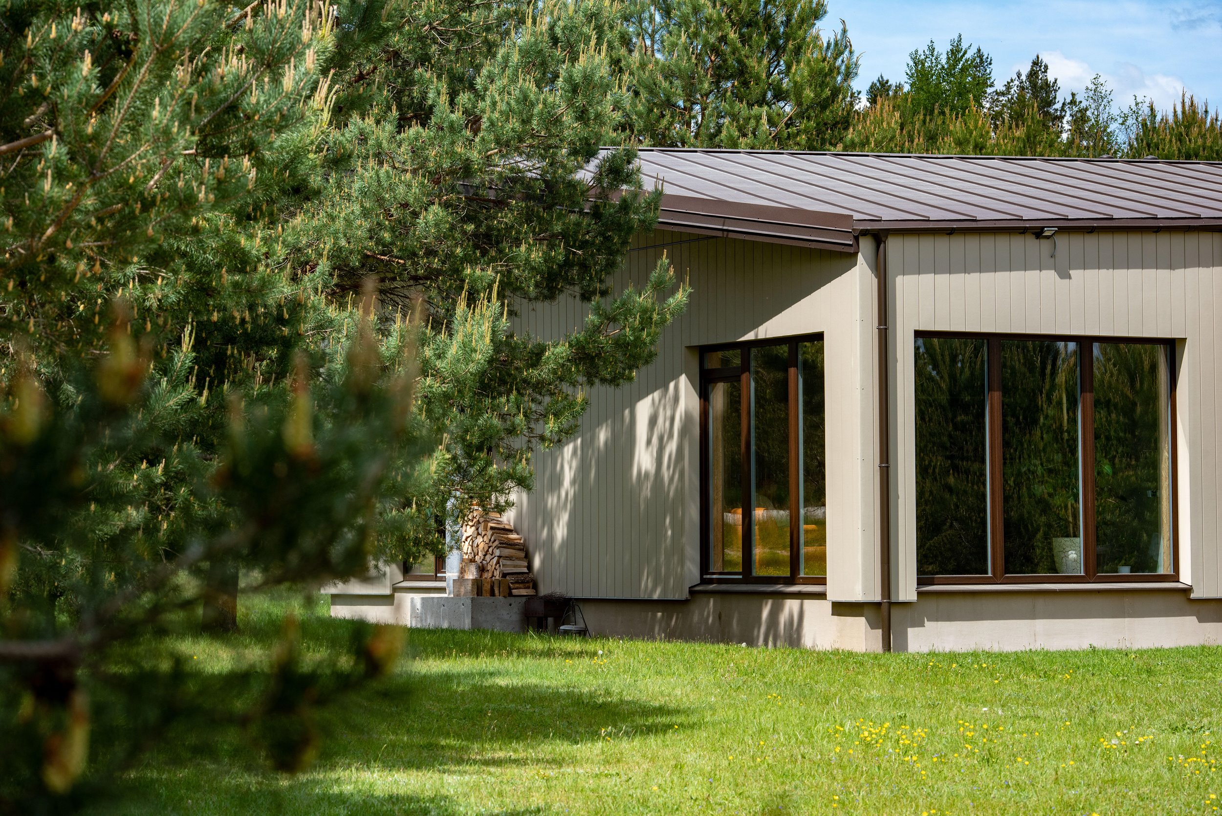 Erdvus kiemas kuriame auga pušelės, gražiai prižiūrėta veja (nereikalaus daug laiko ir pastangų priežiūrai);