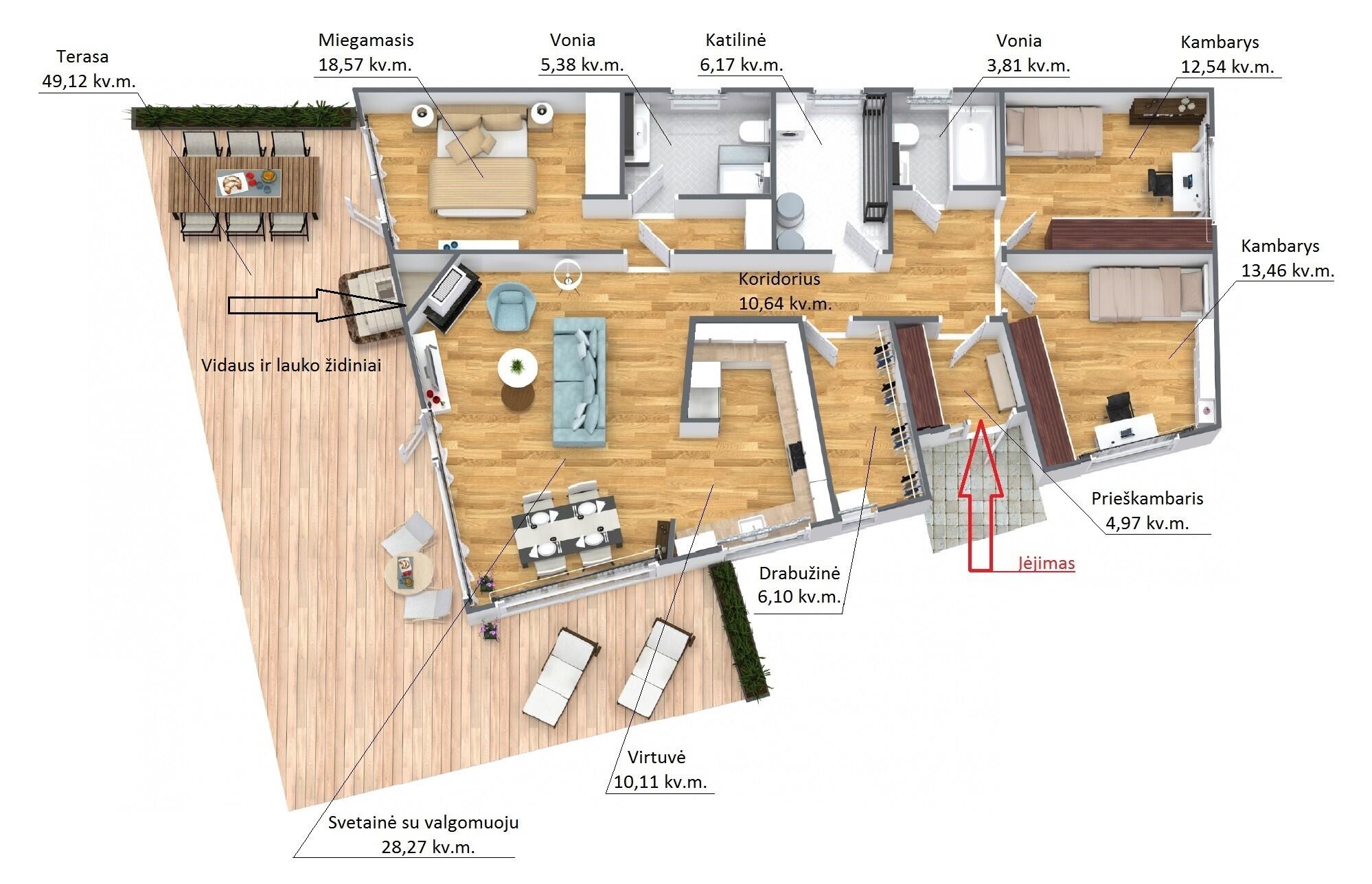 Vieta terasai ~50 kv.m. su pamatu lauko židiniui ir kaminu, kur galėsite džiaugtis pietvakarine saule ir didžiuotis savo kulinariniais sugebėjimais;