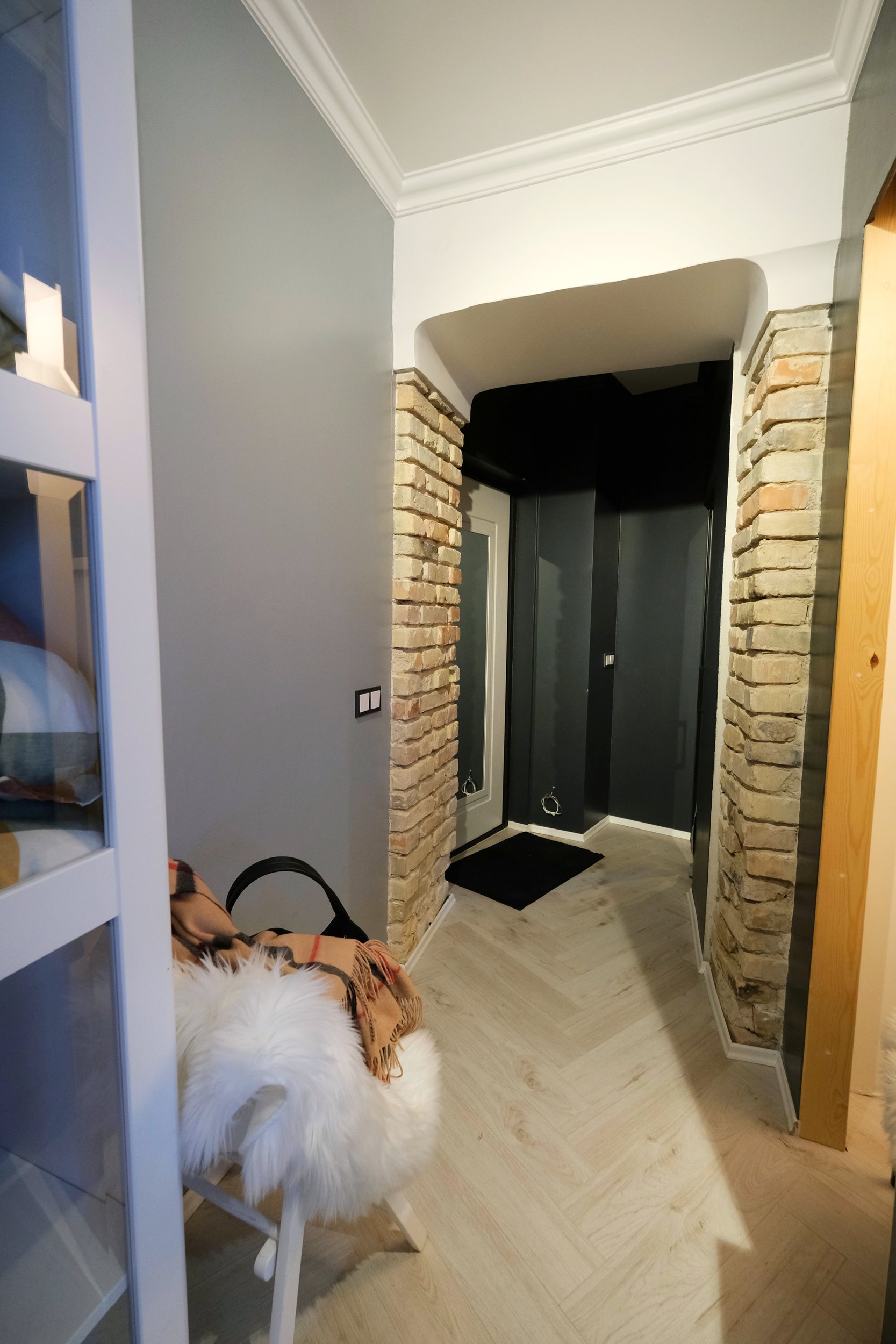 Interjere dera natūralios medžiagos, autentiškos sienos detalės ir šiuolaikiniai sprendimai, sukuriantys jaukią, bet kartu solidžią atmosferą.