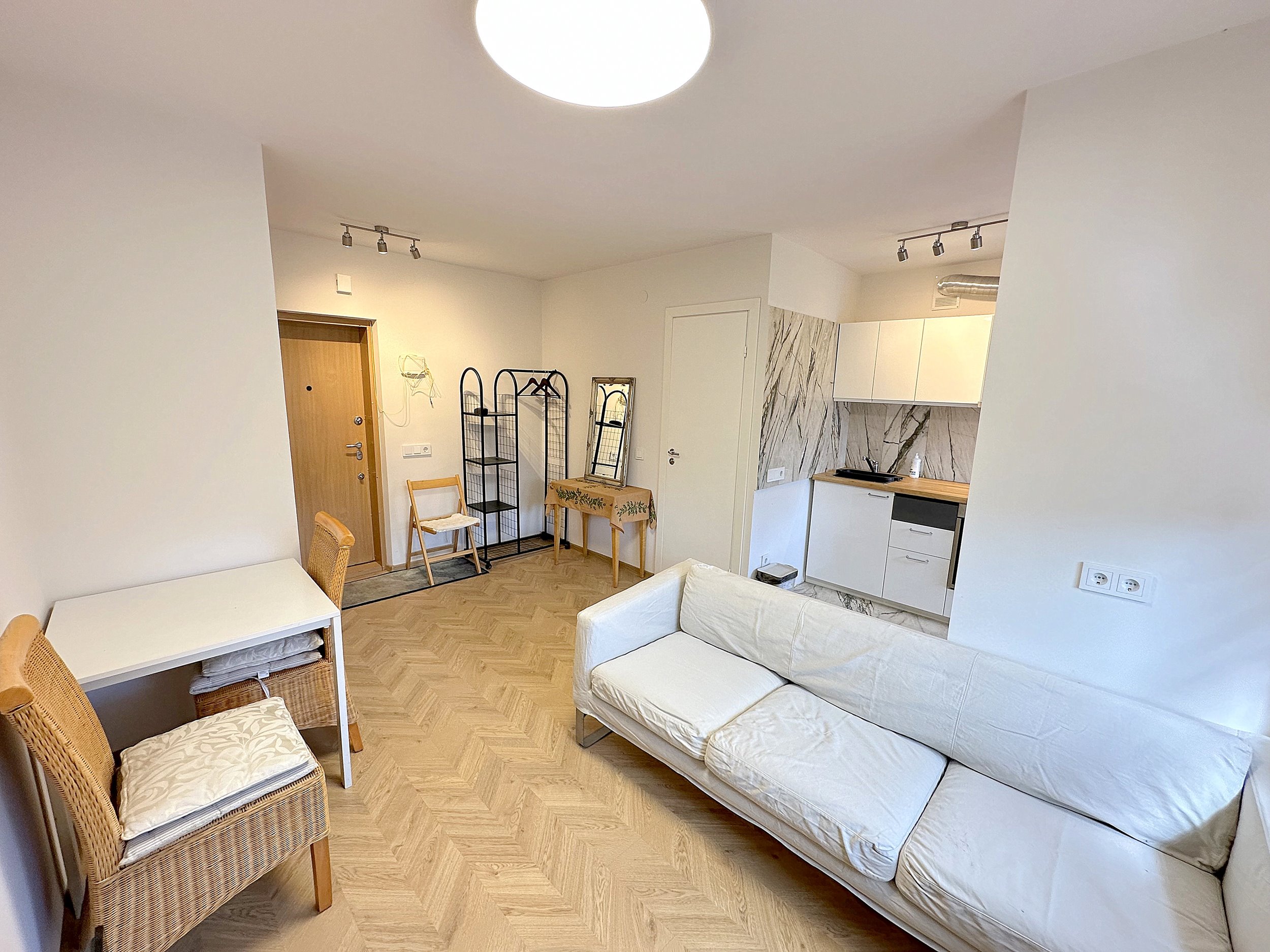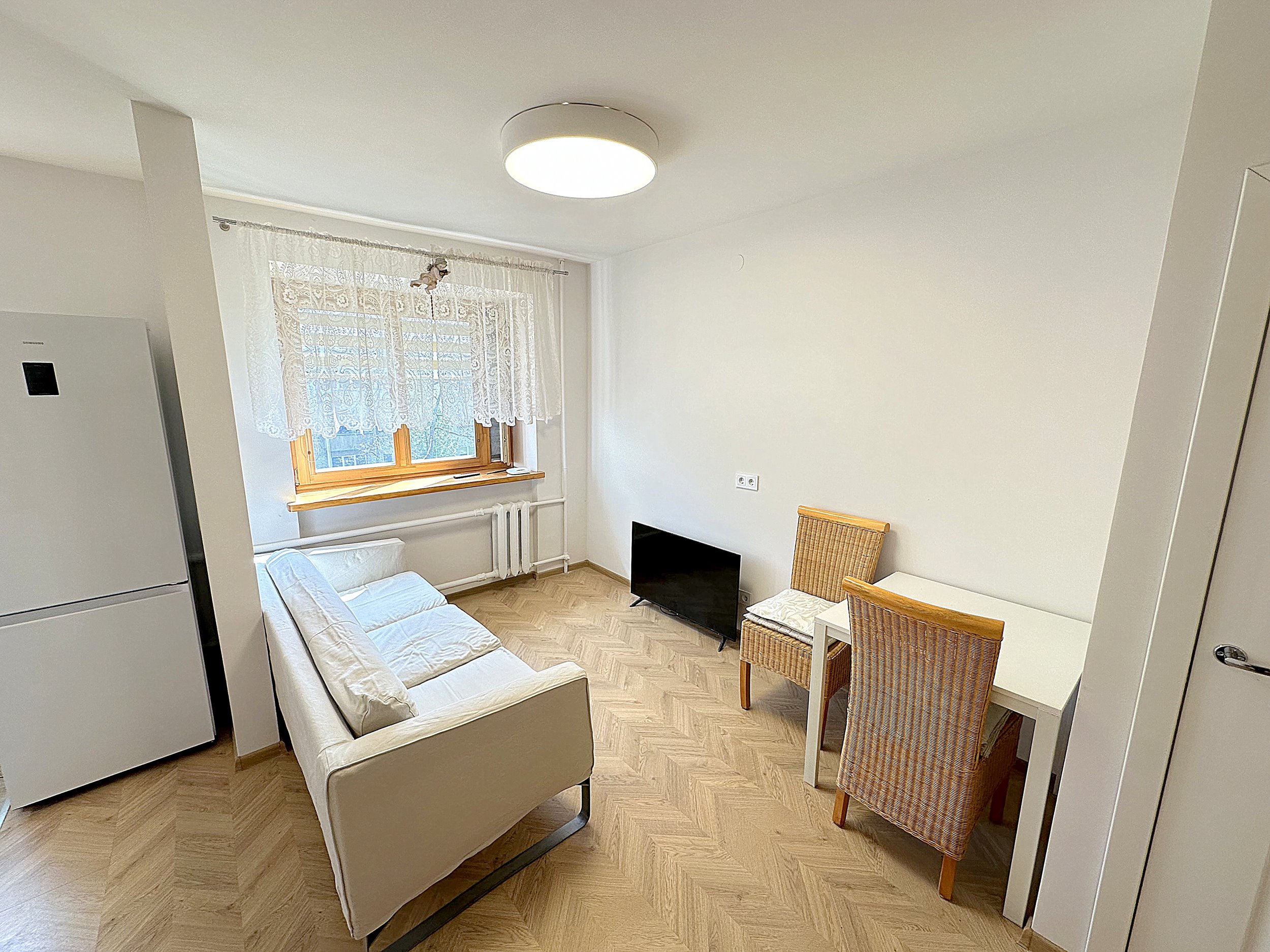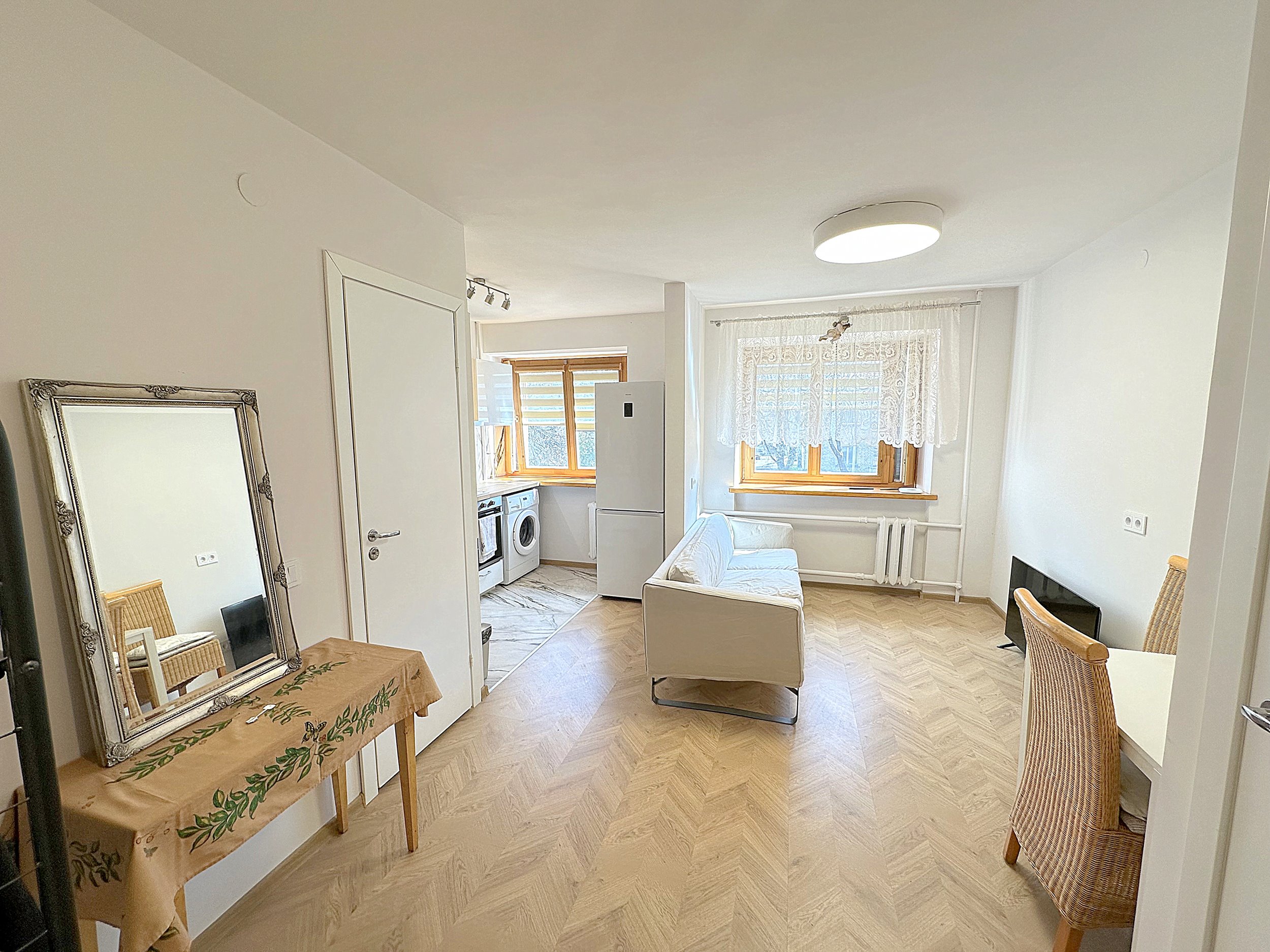 Erdvi bei šviesi svetainė kartu su virtuvės zona, jaukus IZOLIUOTAS miegamasis. WC ir dušo kabina kartu.