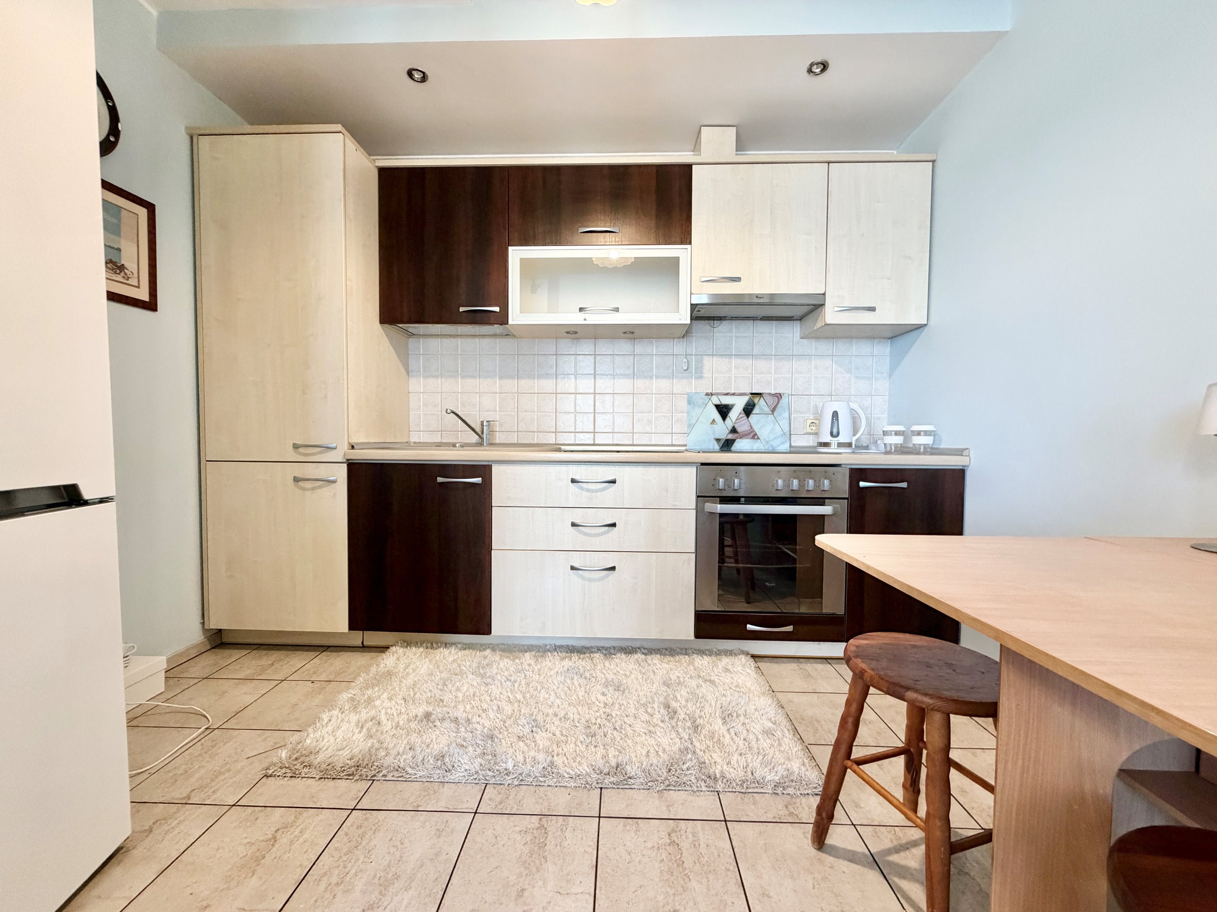 Bute yra visi reikalingiausi baldai: skalbimo mašina, šaldytuvas su šaldikliu, viryklė ir t.t.