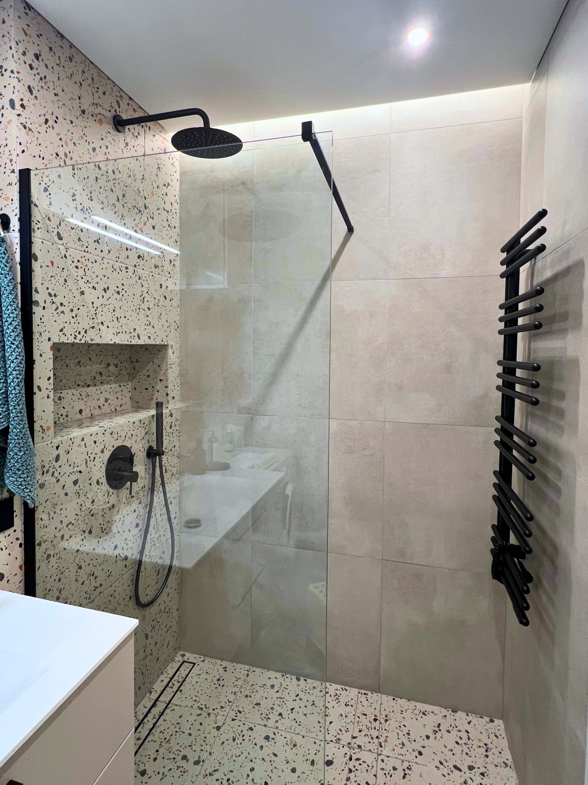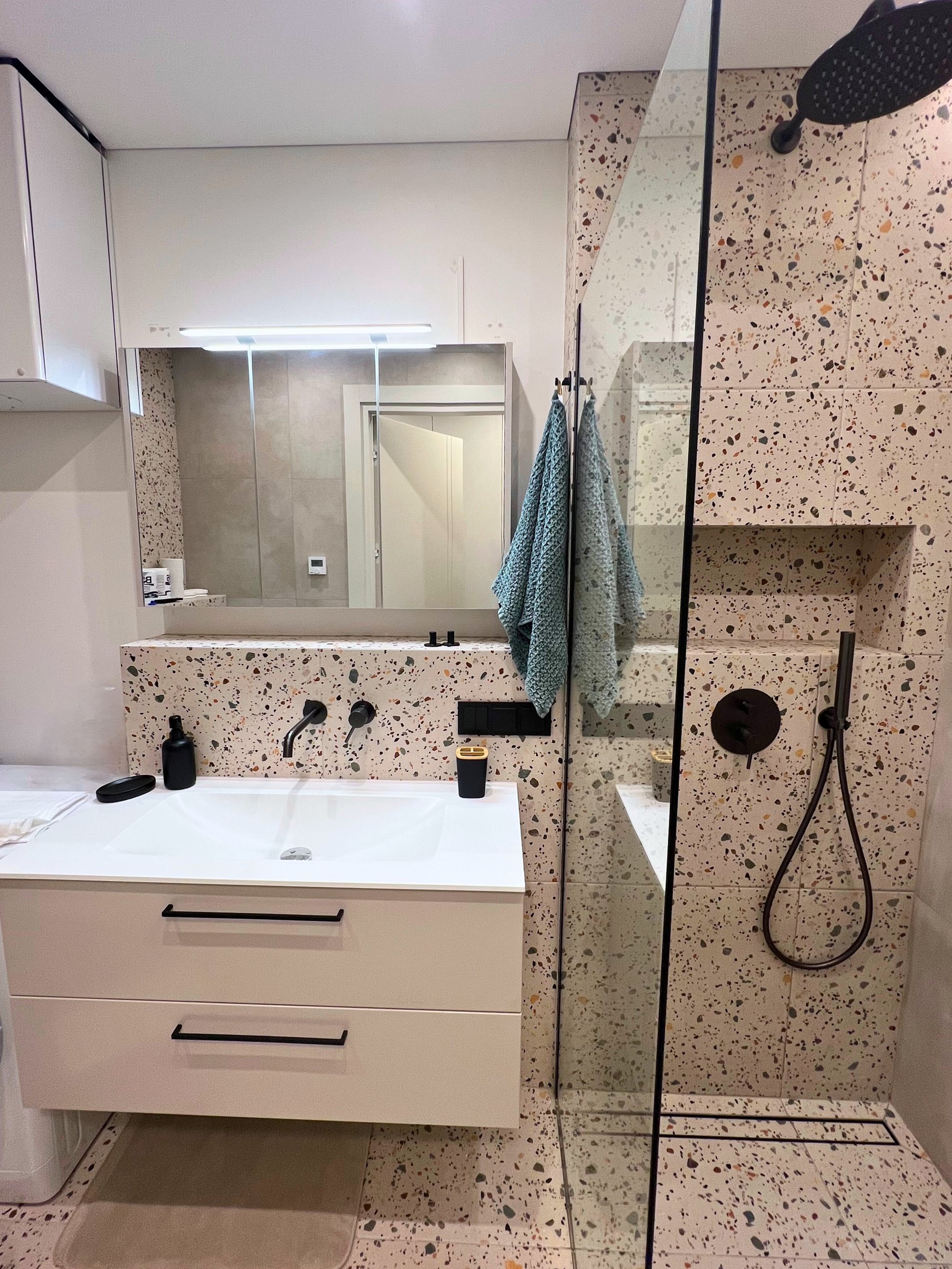 (Integruotas šaldytuvas, orkaitė, gartraukis, skalbimo mašina su džiovykle.)