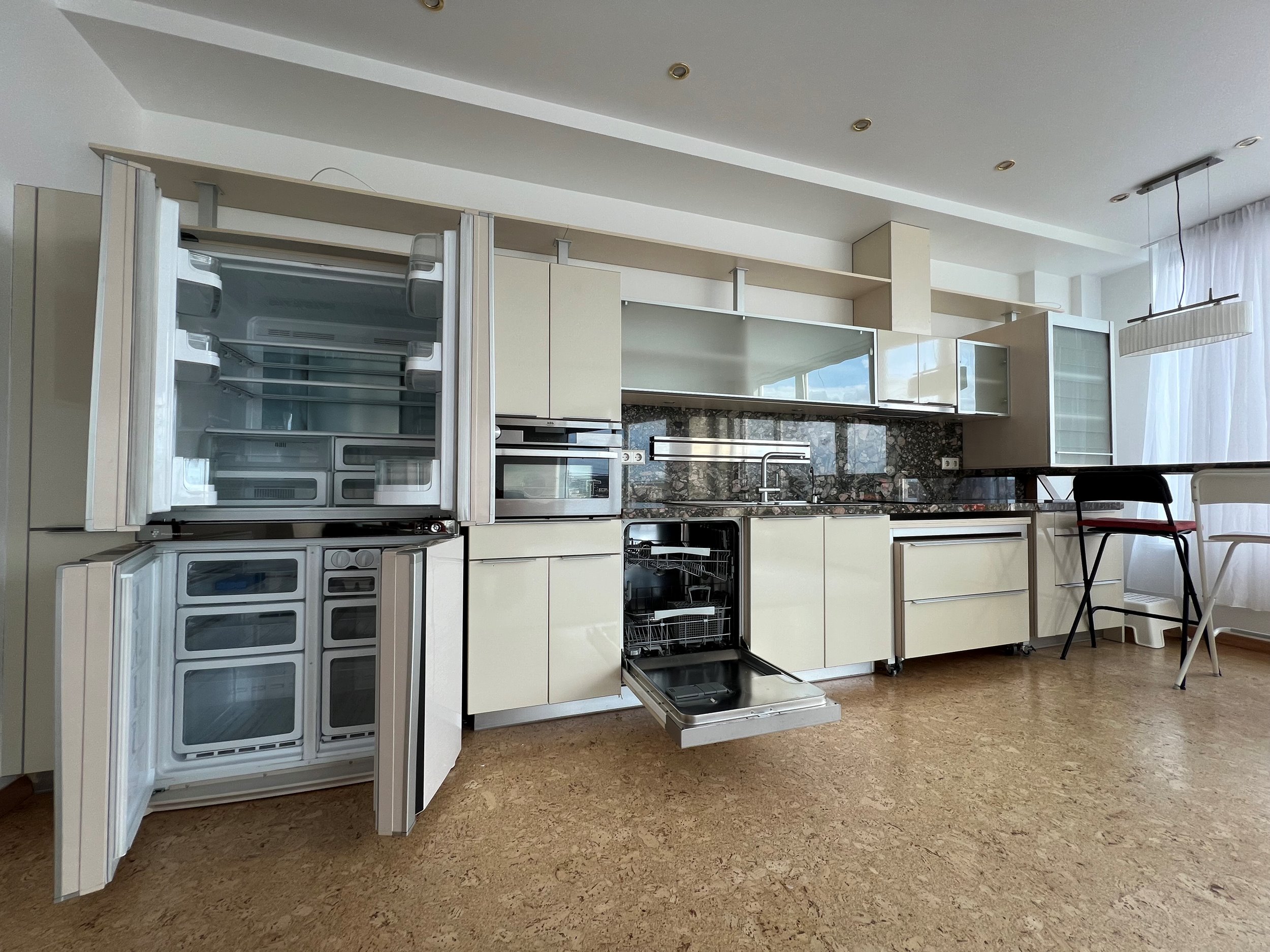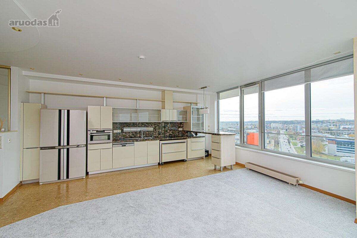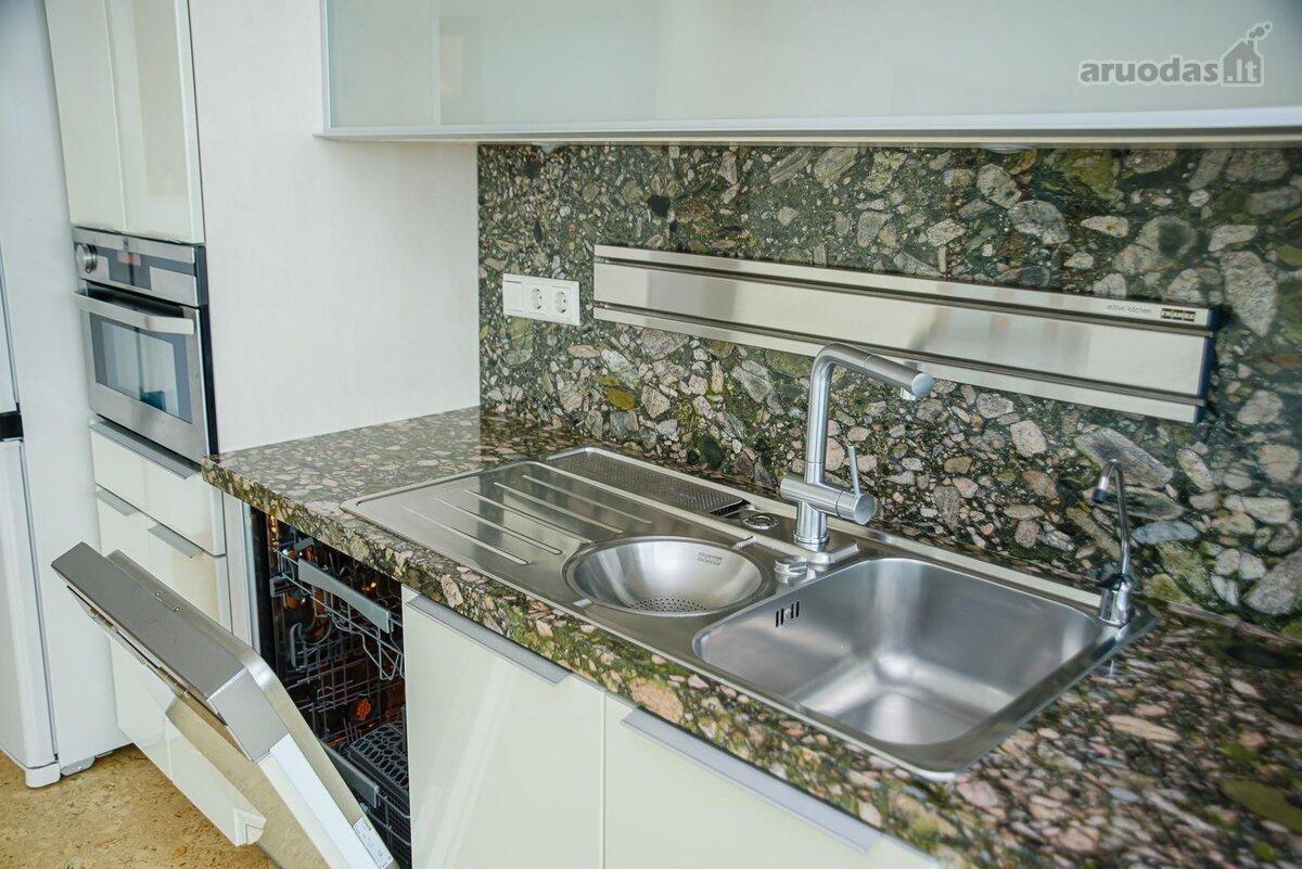 skalbimo mašina, džiovinimo mašina, indaplovė, kondicionierius, dideliu amerikietišku šaldytuvu, orkaite ir k.t. Yra valgomasis stalas transformeris. Visi virtuvės baldai gaminti pagal specialų užsakymą, butas įrengtas dizainerės tik iš kokybiškų medžiagų.