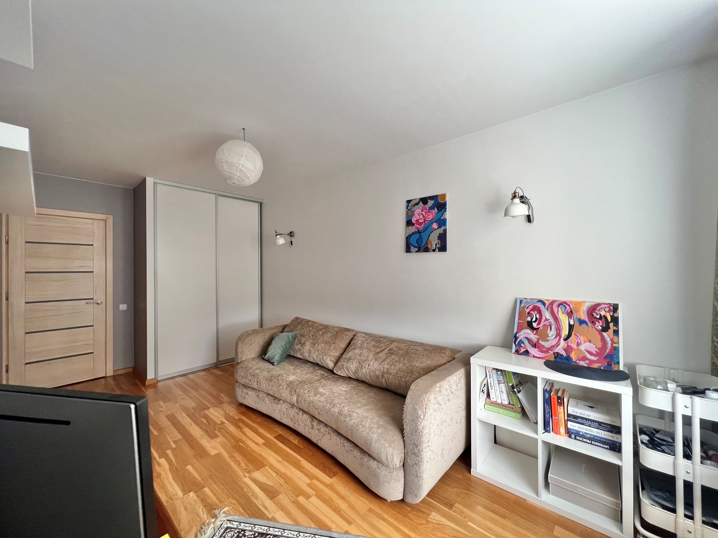Butas labai šviesus, dideliais langais į rytus ir vakarus. Turi balkoną miegamajame.