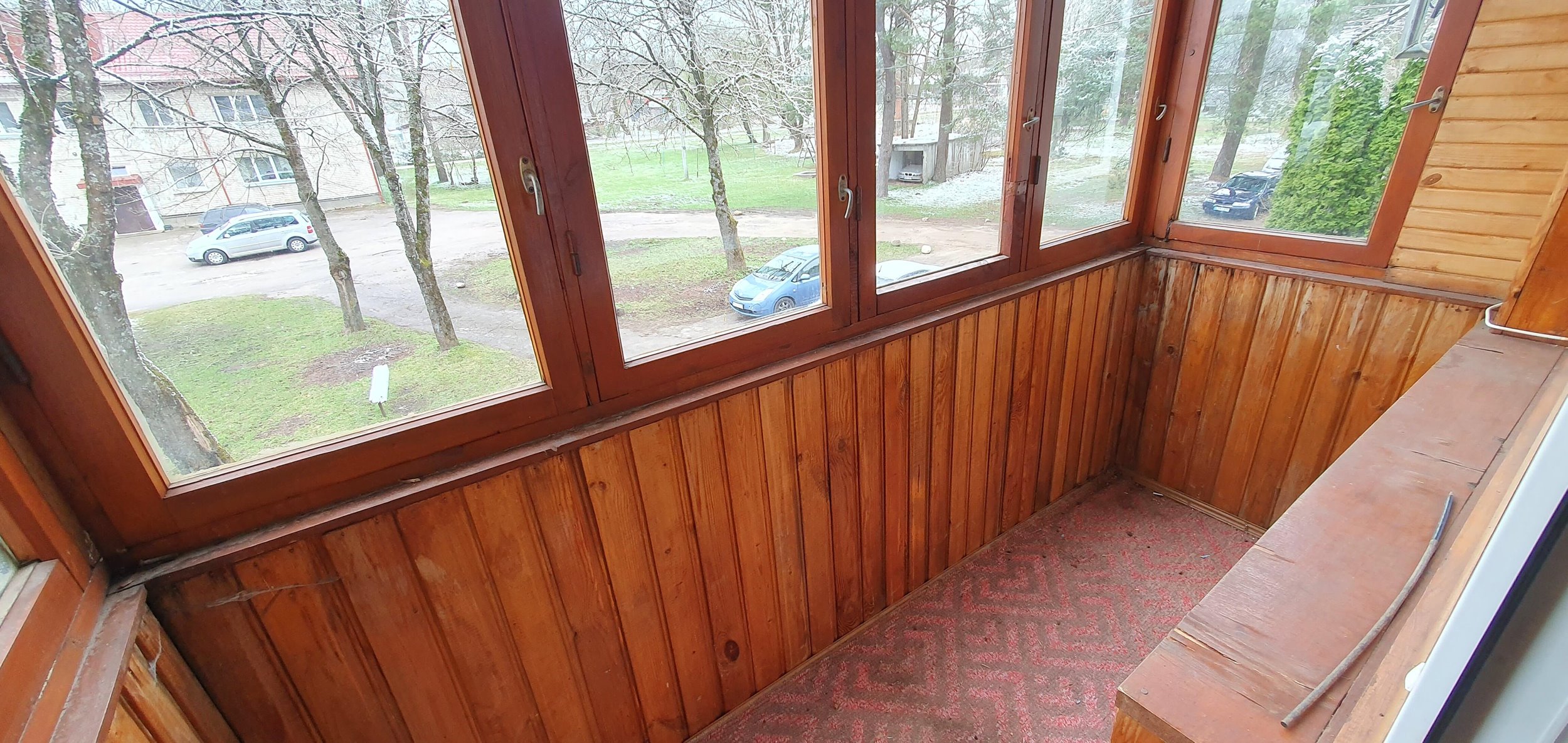 Išdėstymas: virtuvė, vonia, pereinamas kambarys, kitas kambarys ir balkonas. Taip pat butui priklauso rūsys.
