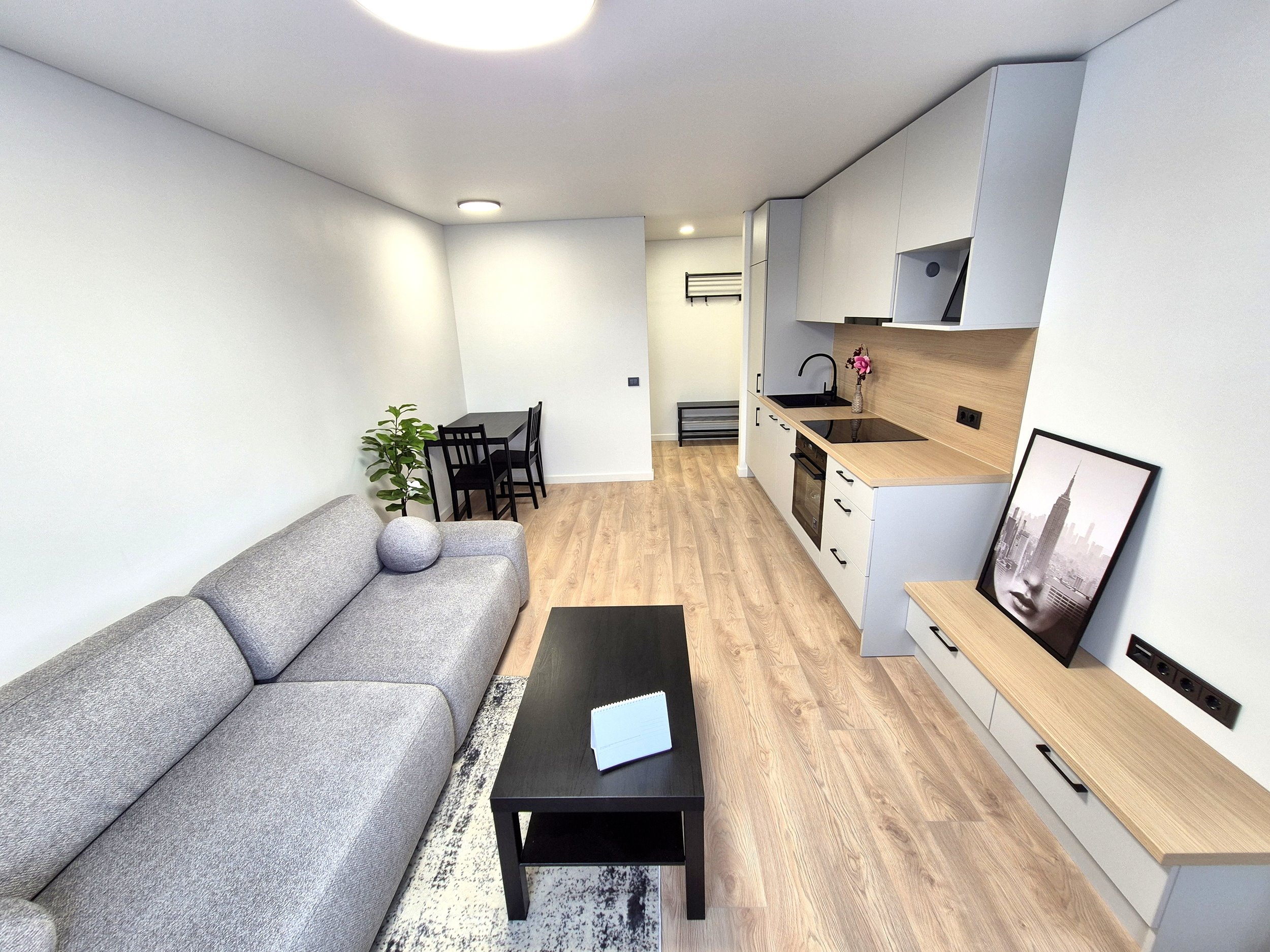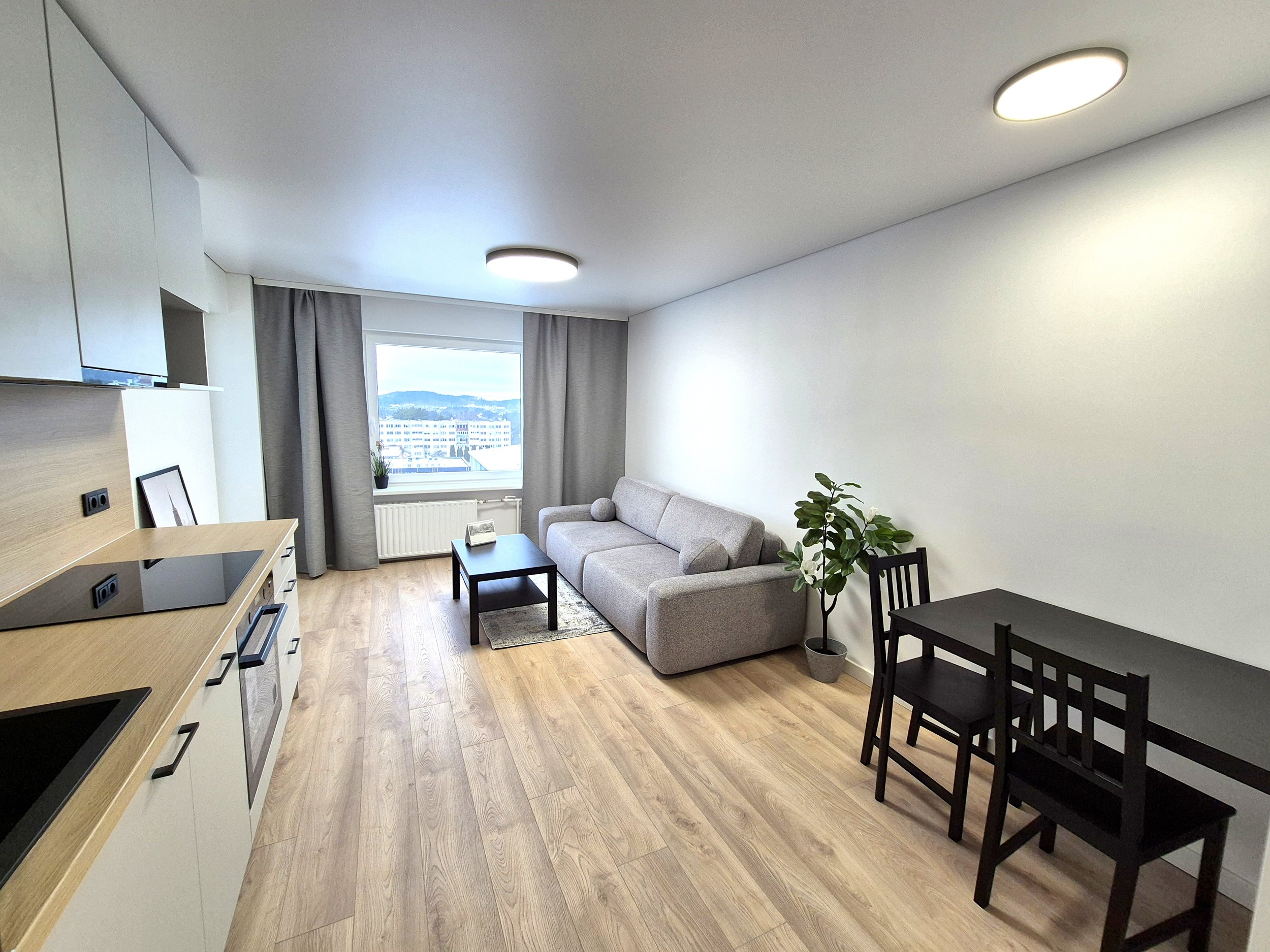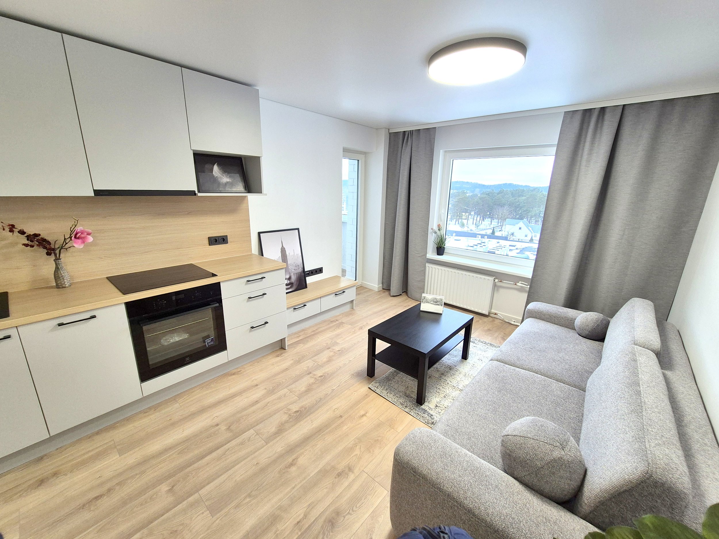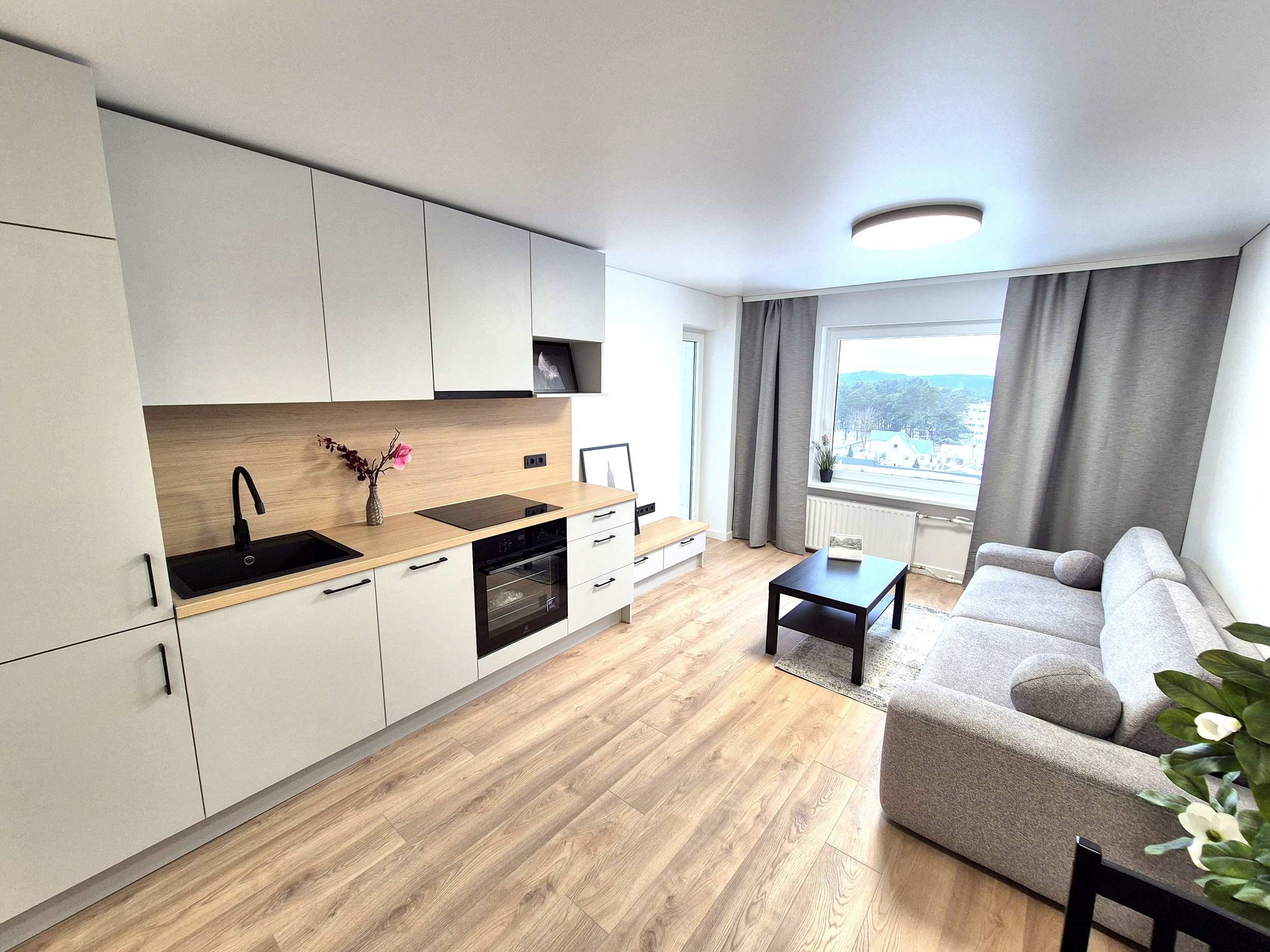 - I KAMBARYS - SVETAINĖ SU VIRTUVE APSTATYTA BALDAIS (Nauja Sofa su miegamojo funkcija ir patalinės dėže, virtuvės stalas su kėdėm, žurnalinis staliukas, užuolaidos)