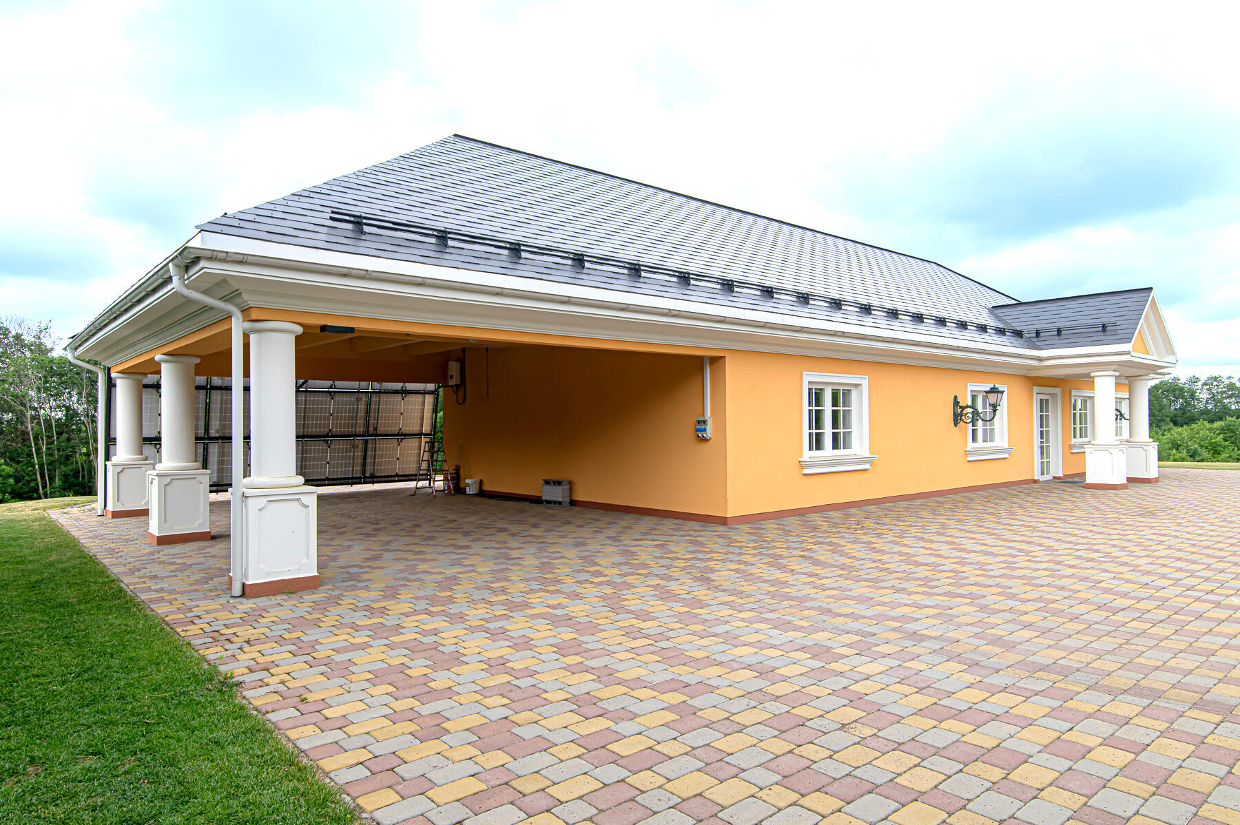 Teritorija išklota betoninėmis, spalvotomis senamiesčio trinkelėmis. Po stogu įrengtos dvi automobilių parkavimo vietos. Žolės pjovimu rūpinasi 4 WD (visureigis) vejos robotas.