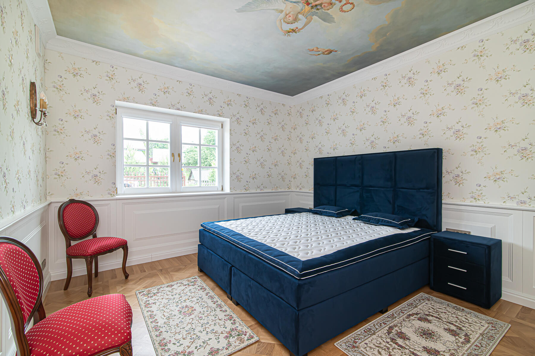 - Didajame mažajame miegamajame, darbo lubos išklijuotos prancūziškais tapetais.