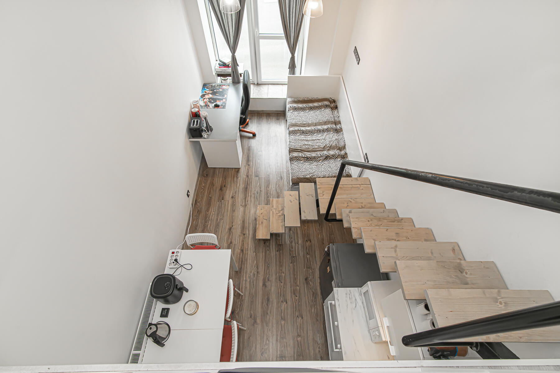 Buto išplanavimas: kambarys kartu su virtuve, miegama zona antrame aukšte, dušas kartu su WC, išėjimas pro langa ant stogo, galima naudoti kaip terasą.