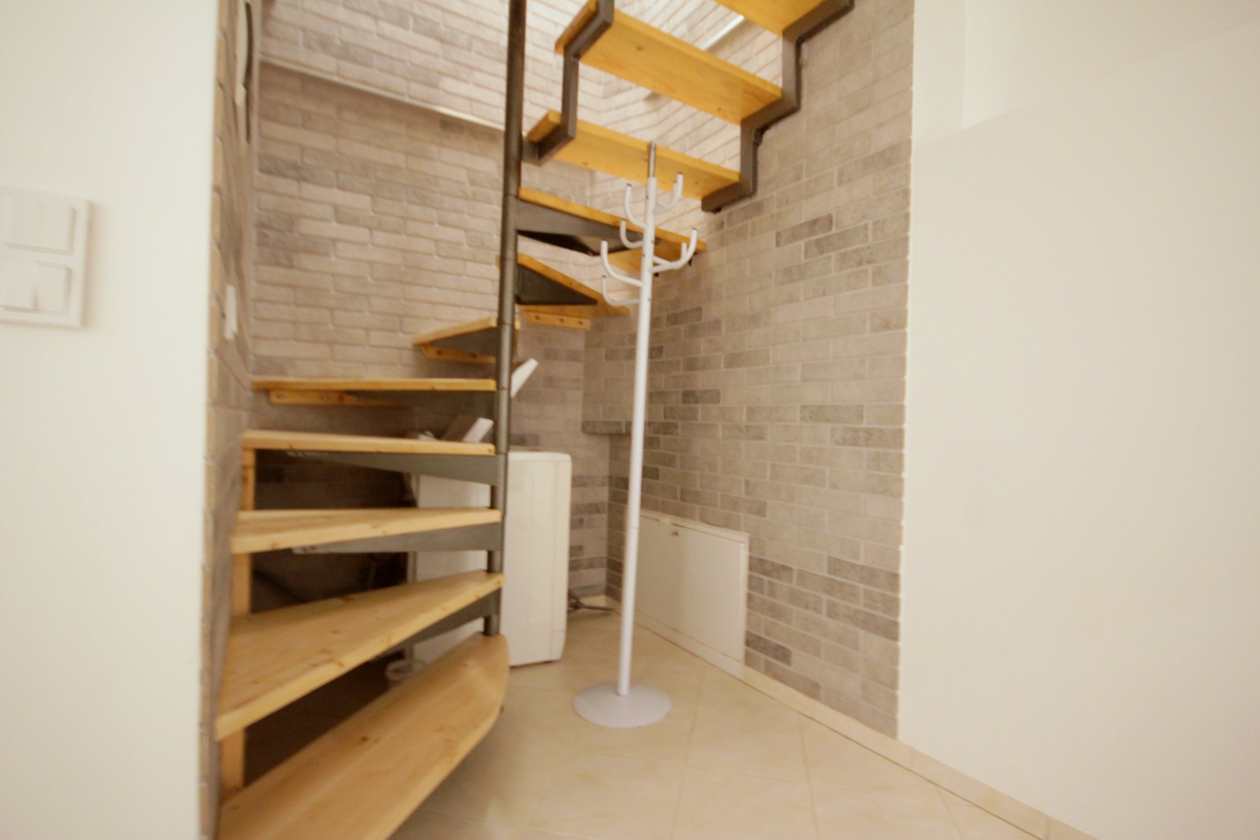 Atskiras įėjimas iš lauko, užėjus pro duris yra du 2-jų kambarių butai  pirmo aukšto butas 44 kv.m. ir cokolinio aukšto buto plotas 51 kv.m.