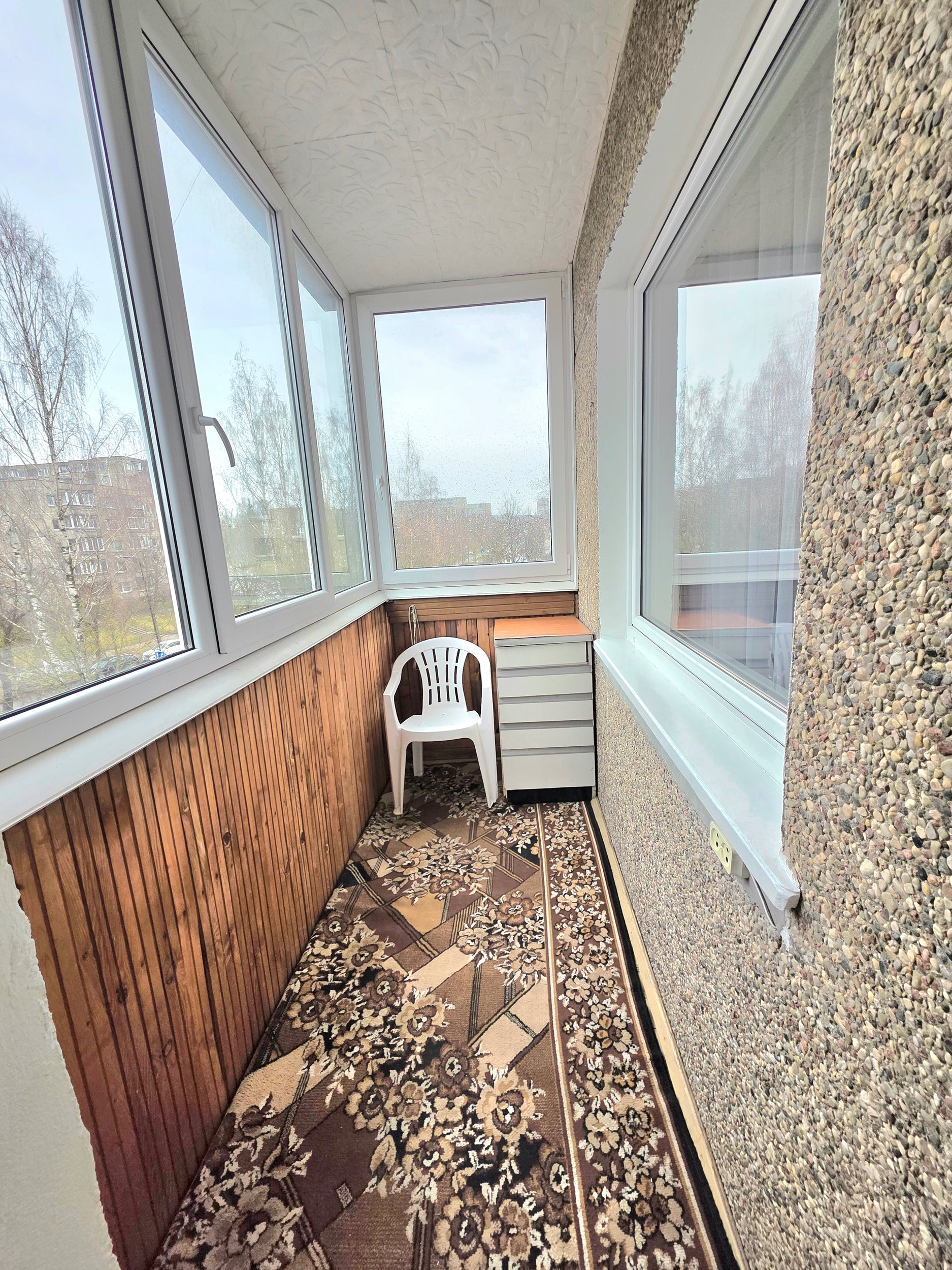 Butas su įstiklintu balkonu, atskira virtuve.