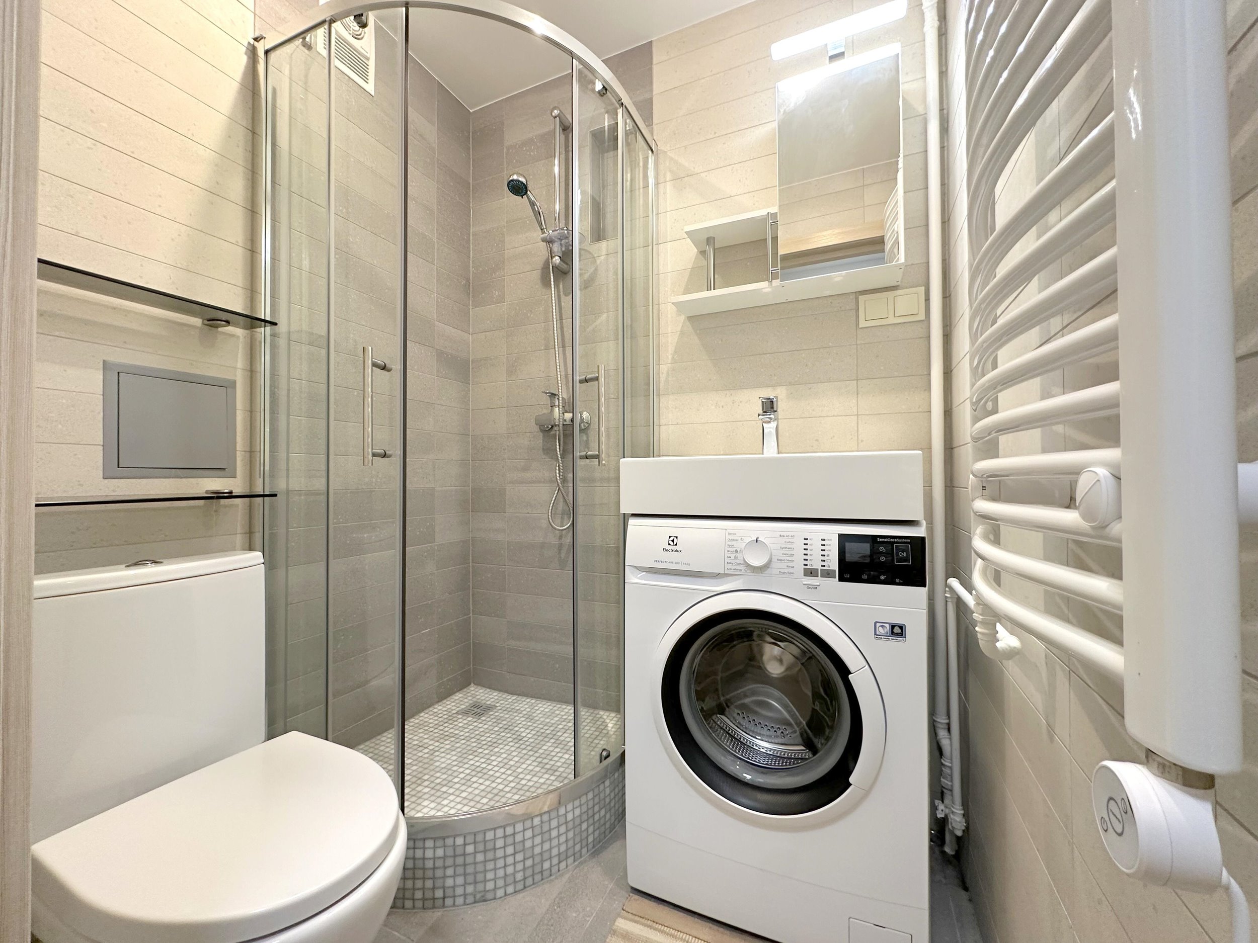 Bute yra visi reikalingiausi baldai, skalbimo mašina, šaldytuvas, viryklė ir t.t.