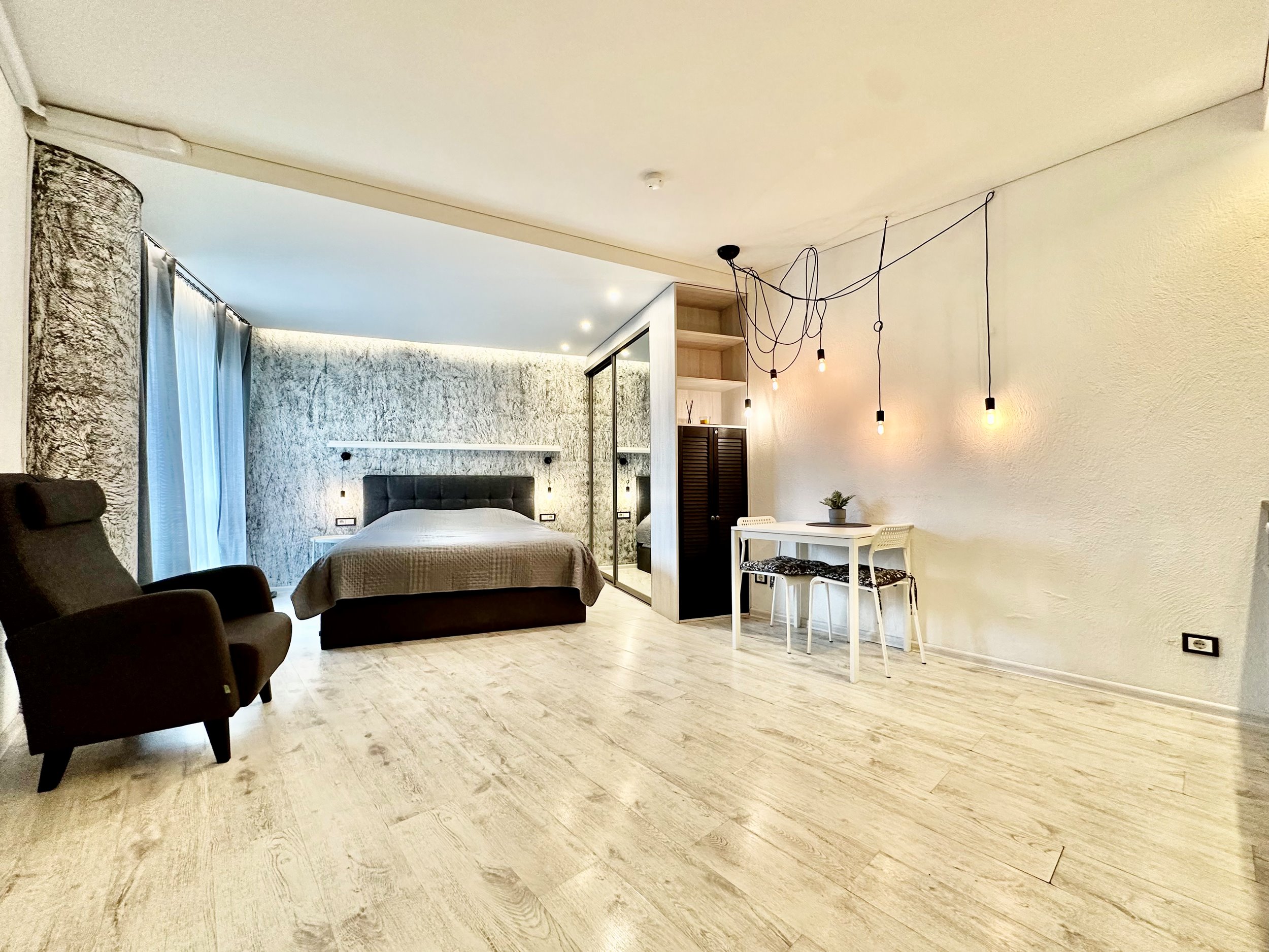Išplanavimas: kambarys su virtuvė, balkonas, tualetas ir dušas.