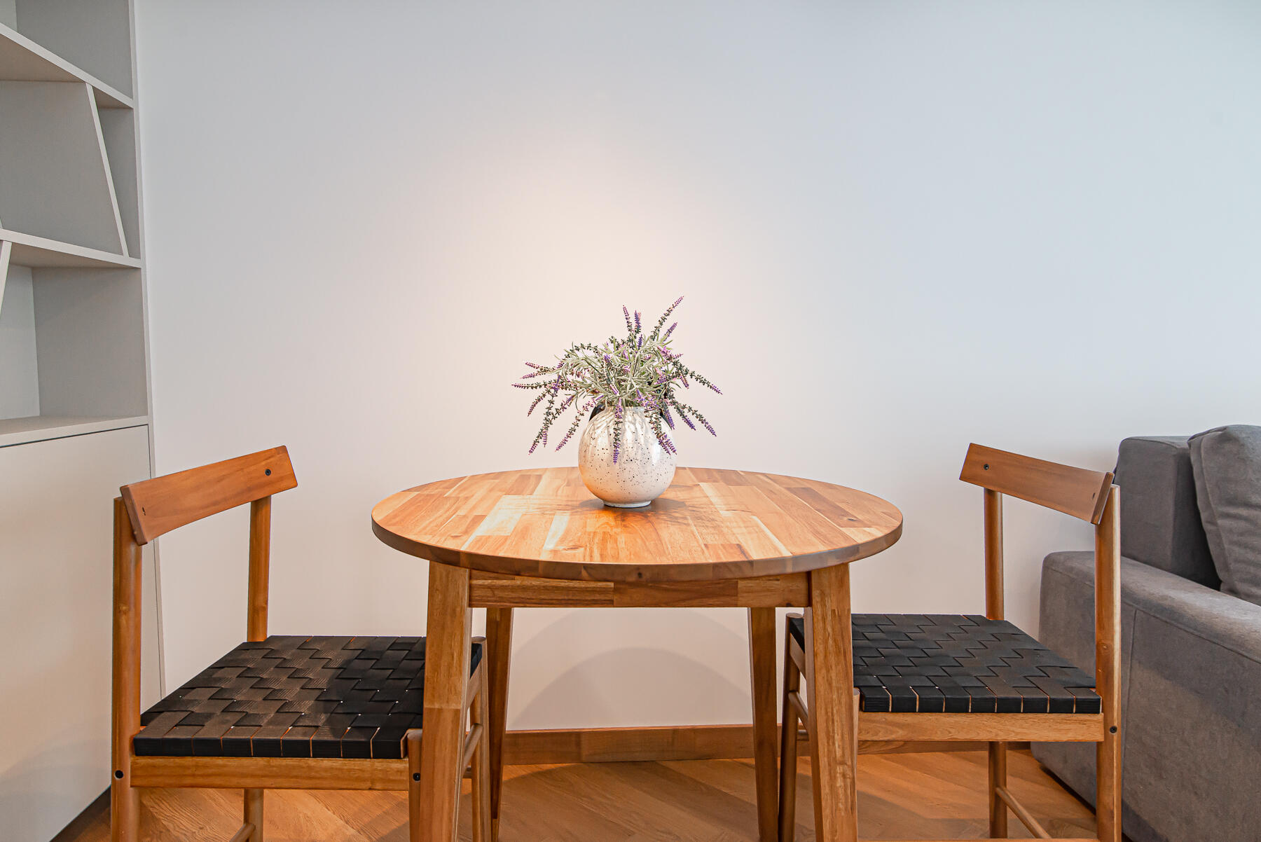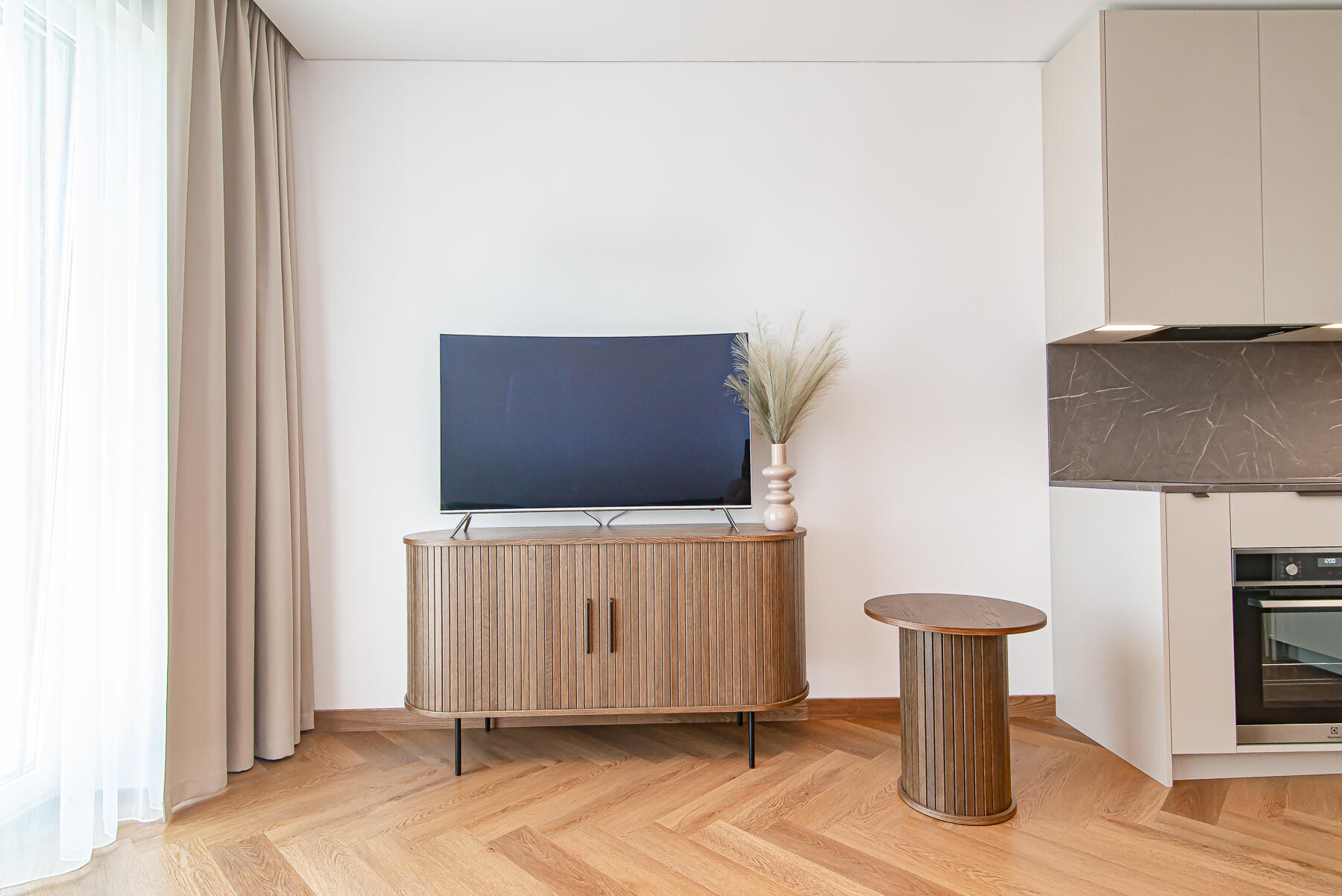 - Patogiai įrengta virtuvė, sujungta su svetaine ir visa reikalinga buitine technika (kaitlente, orkaite, indaplove, šaldytuvu su šaldymo kamera), sienine spinta, televizoriumi, valgomojo stalu su kėdėmis;