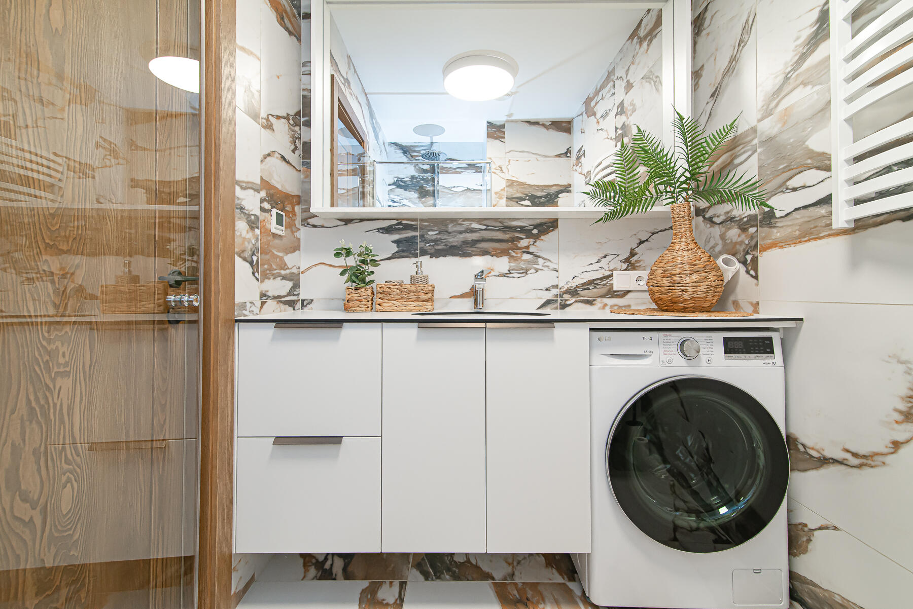 - Vonios kambarys kartu su tualetu, skalbimo mašina, dideliu veidrodžiu su LED apšvietimu;